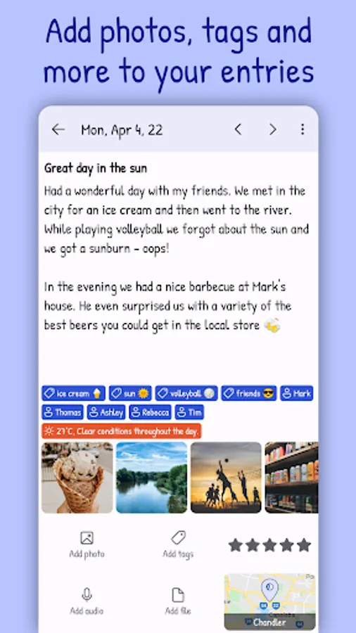 • Attach pictures, videos, audio recordings, files, tags, people, ratings or locations to your journal entries
