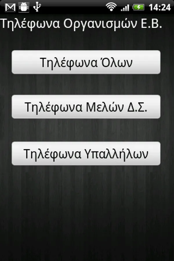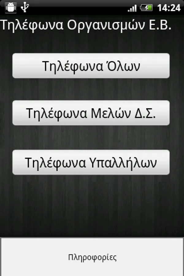Phonebook Organizations Reclamation. On the first screen using the button menu, displays information about the application's operation.