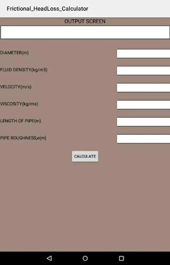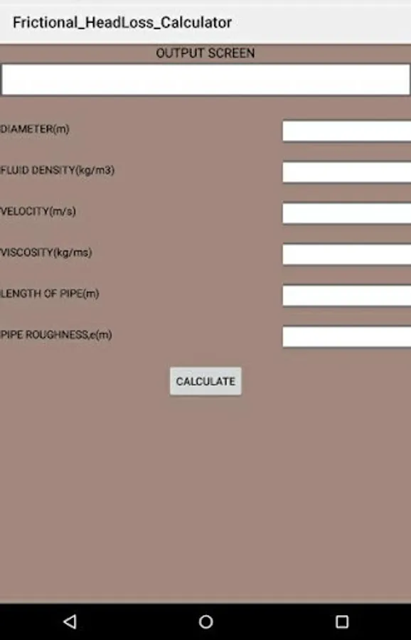 Input parameters for Frictional HeadLoss Calculator include: pipe diameter, length of pipe, average velocity of flow, fluid density, viscosity, pipe wall roughness size, all parameters expressed in S.I unit.
