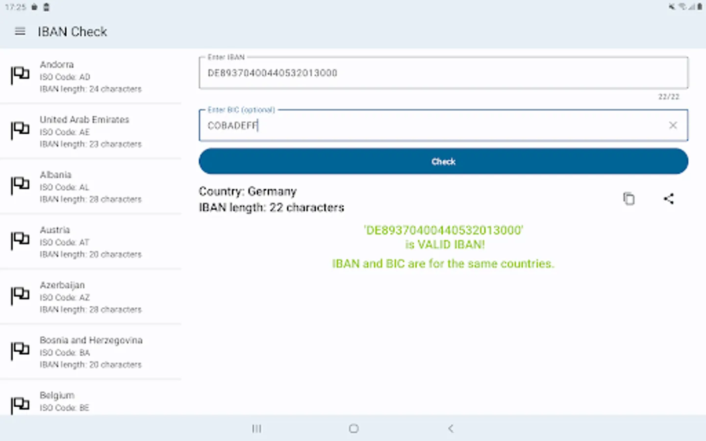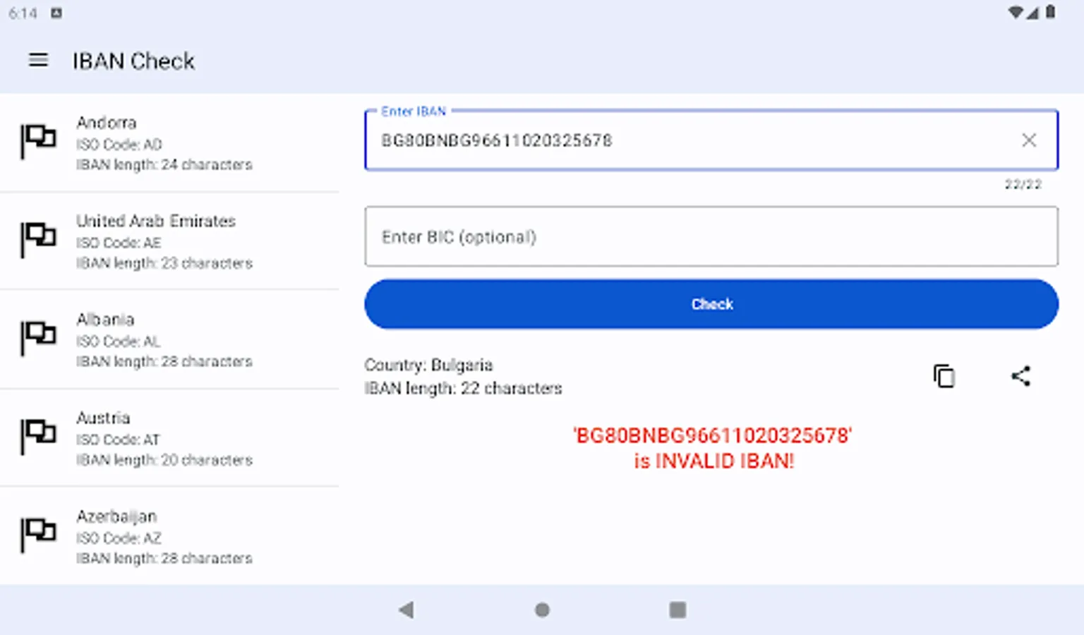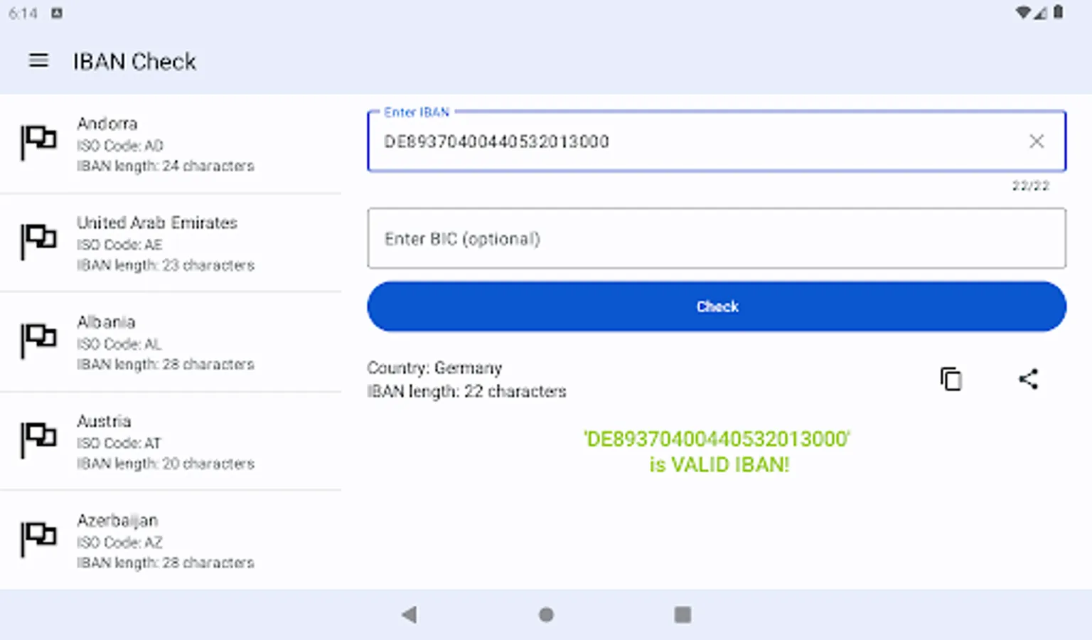Enter your IBAN and our IBAN validation app for Android will do the rest, telling you if the IBAN is valid β or not β. You can share the result of the IBAN validation or copy it to the clipboard for later use.