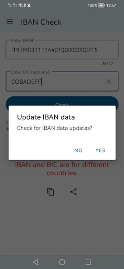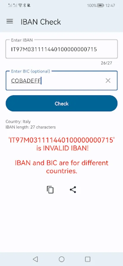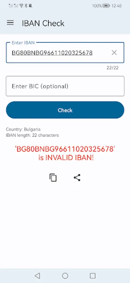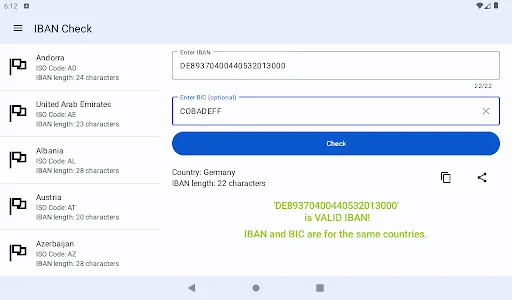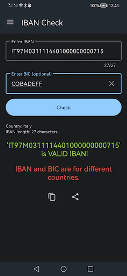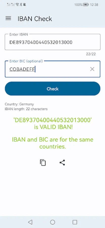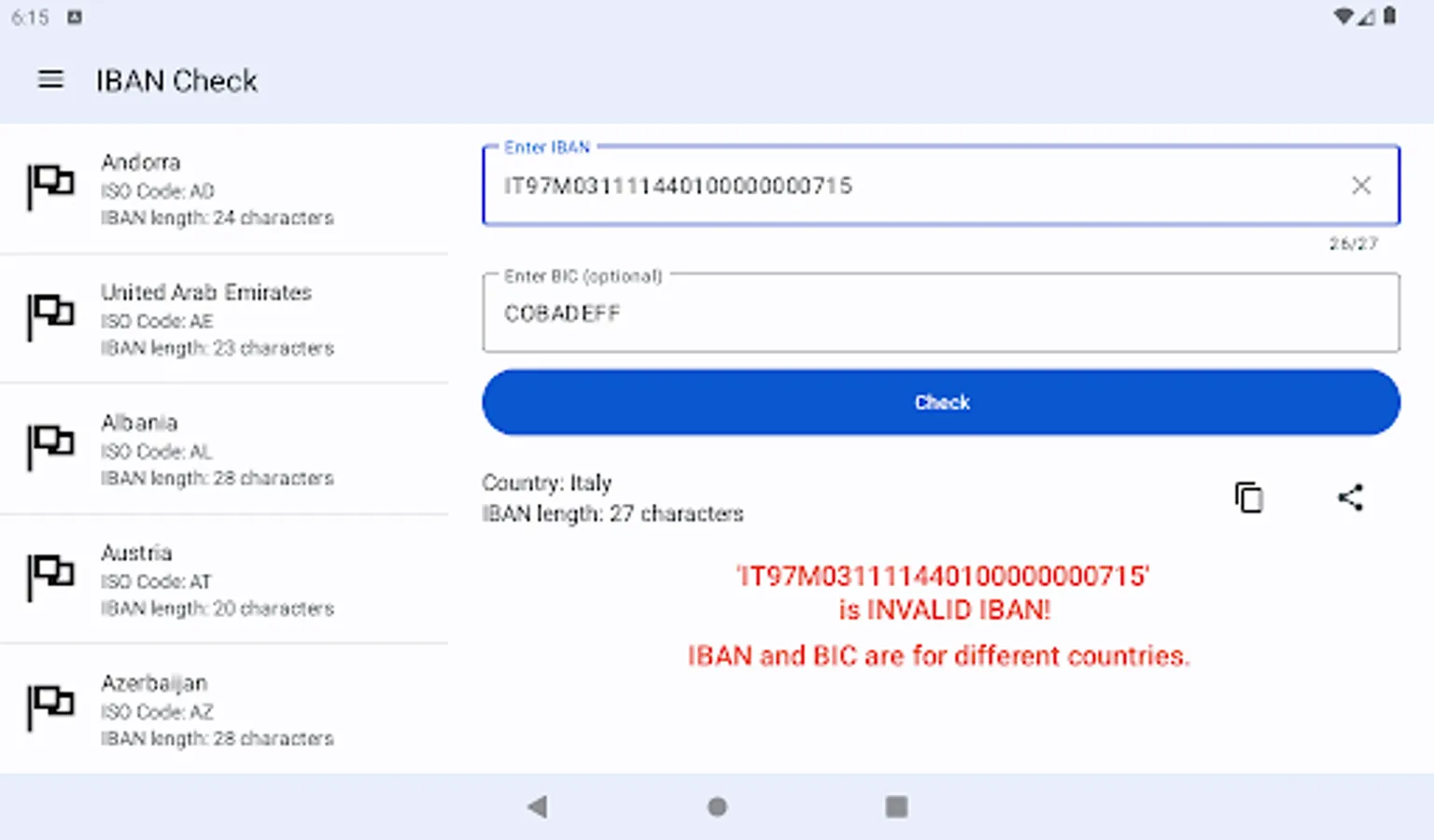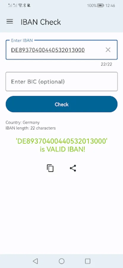 Enter your IBAN and our IBAN validation app for Android will do the rest, telling you if the IBAN is valid β or not β. You can share the result of the IBAN validation or copy it to the clipboard for later use.
