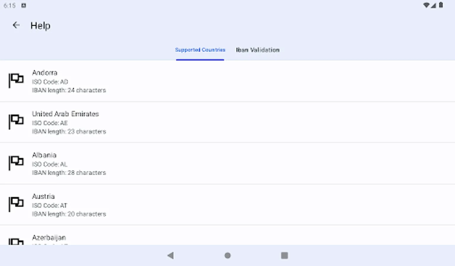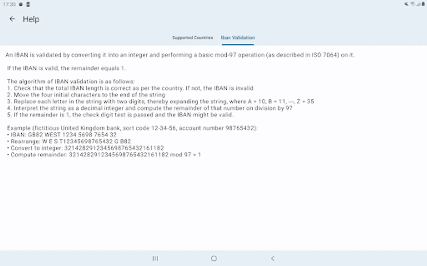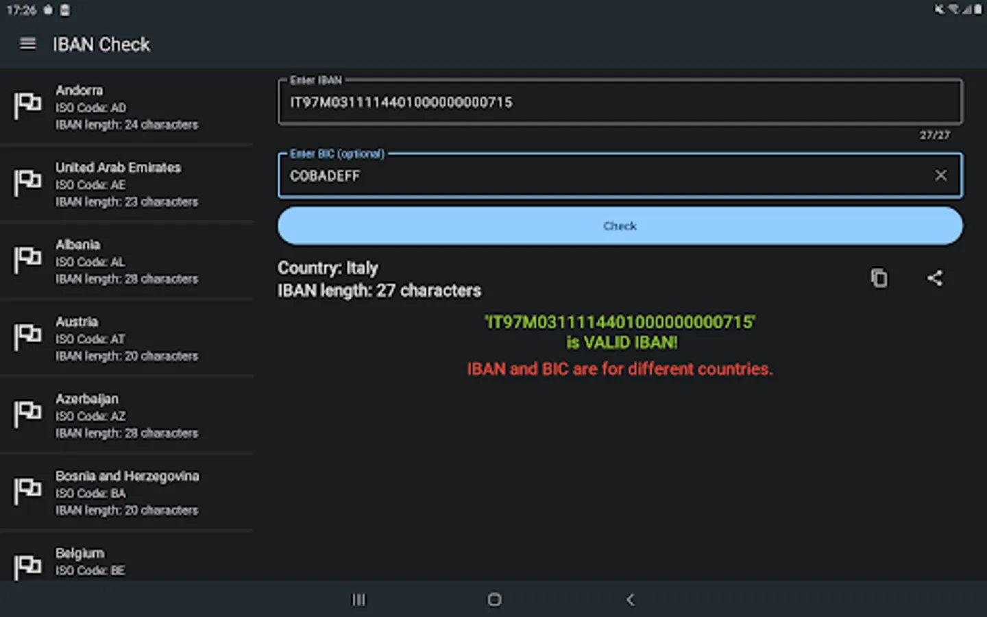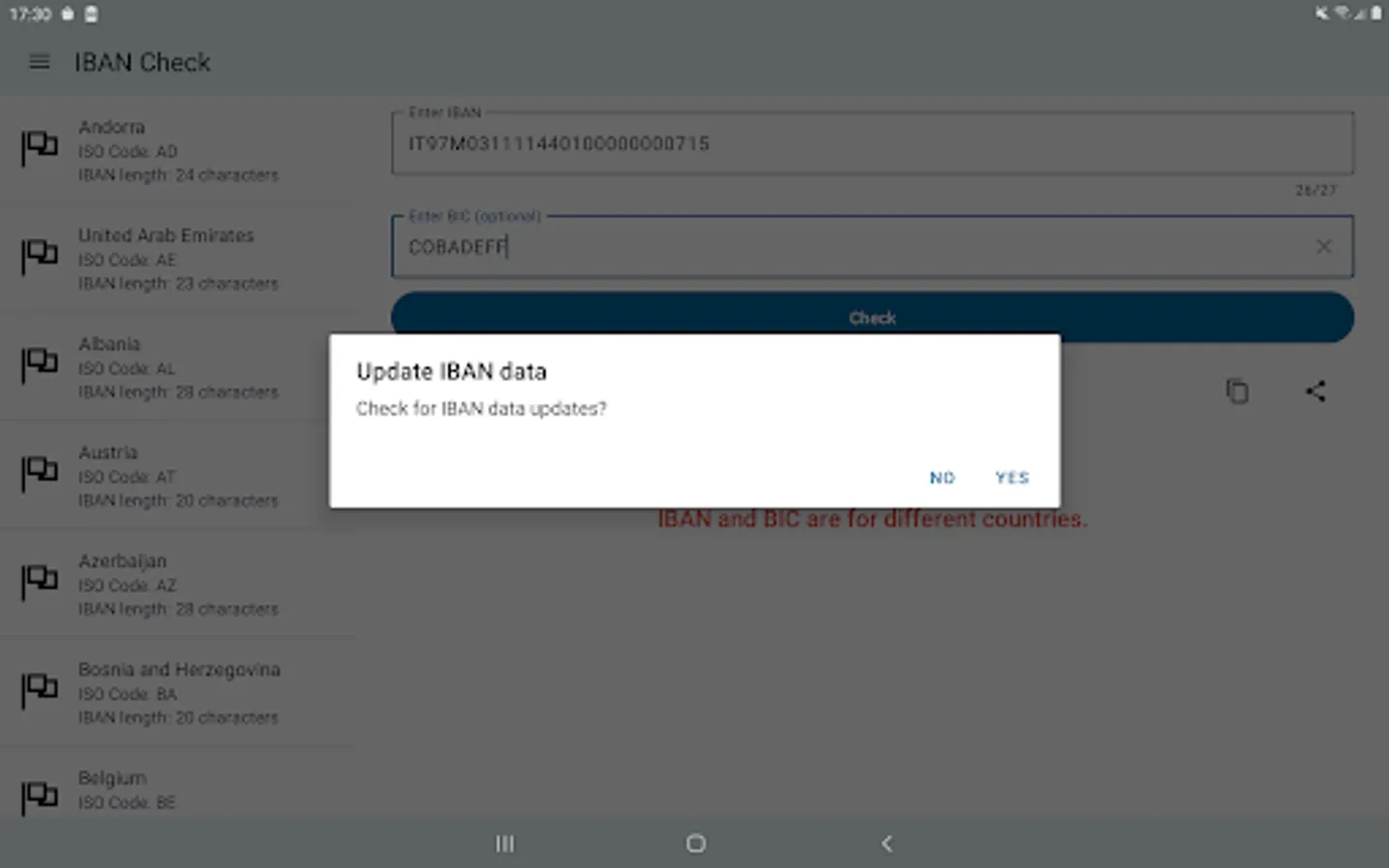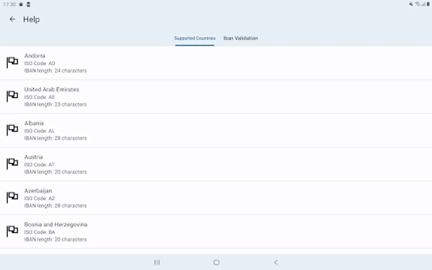 IBAN Check has a list of countries that have introduced IBAN. It helps the app in the validation process. This list is updated regularly.