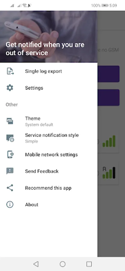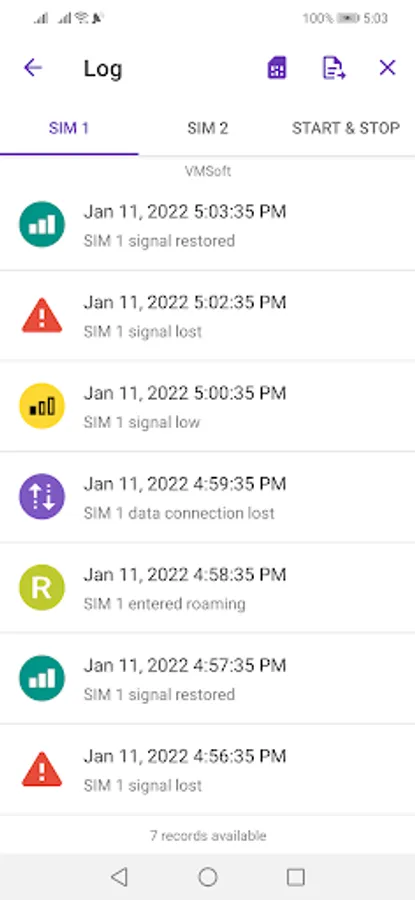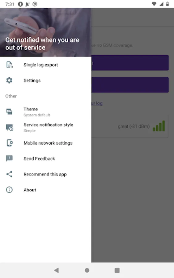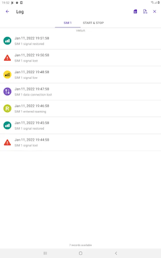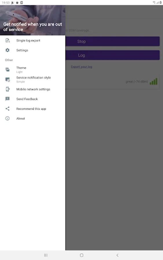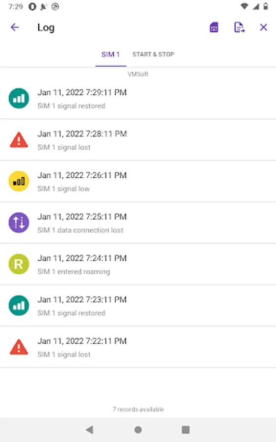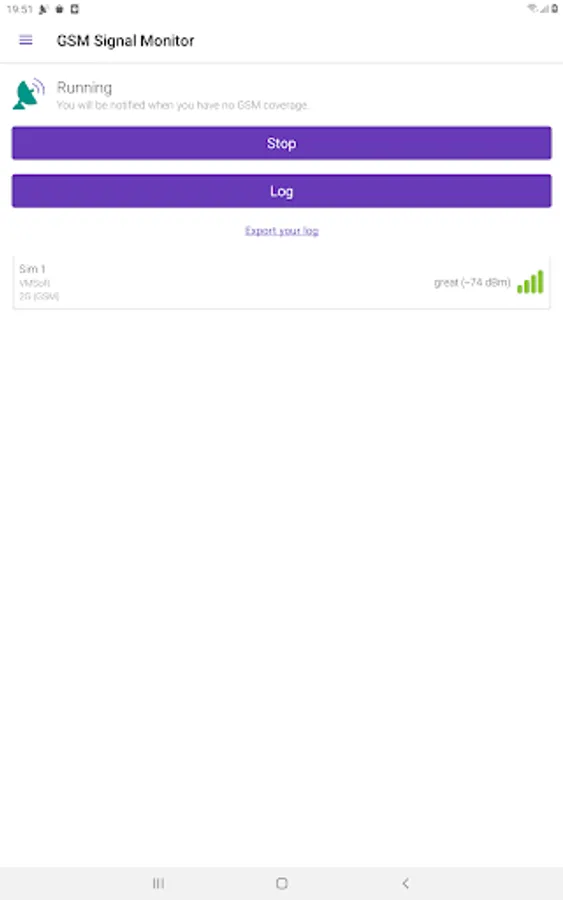 ‘GSM Signal Monitor’ logs every signal related event in its notifications log. The notification log keeps information when the GSM signal is lost, restored or low. It also logs information when the mobile data is lost or roaming is active. You can configure what’s logged in settings. The log can be exported in CSV, PDF and HTML formats.