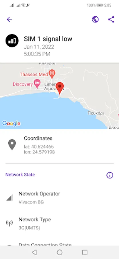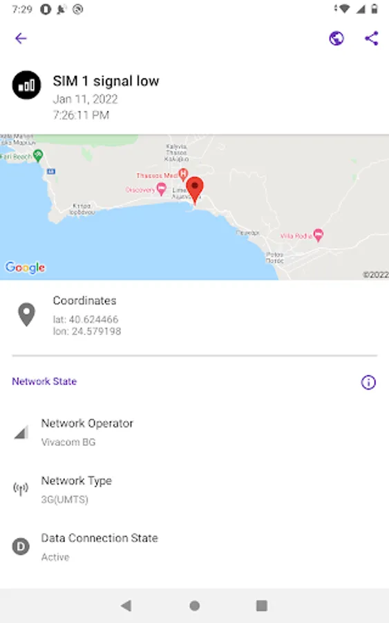 Each logged event contains location and additional details about device and network states such as: network operator, network type, data connection state, roaming state, ram usage, battery temperature, battery state (charging/not charging) and battery level at the time of the event.