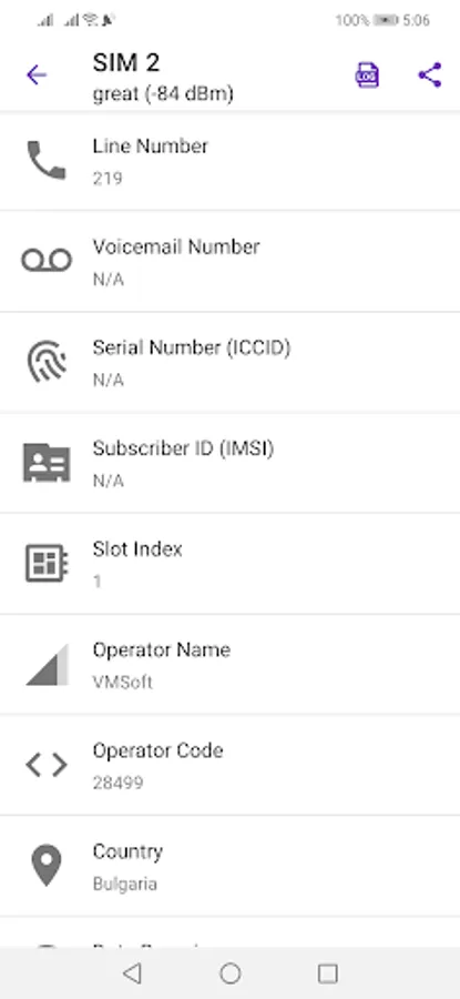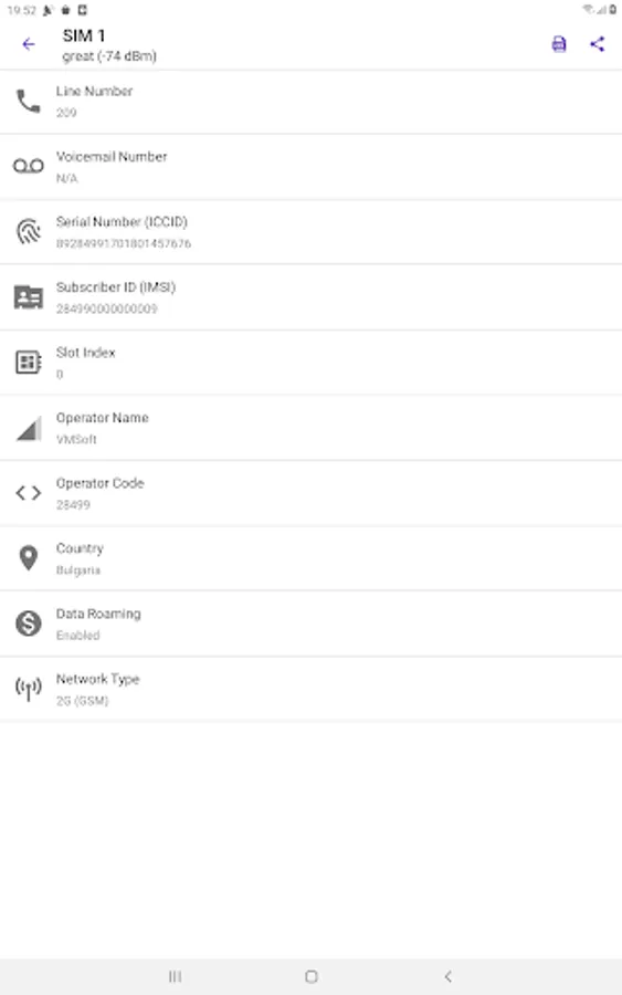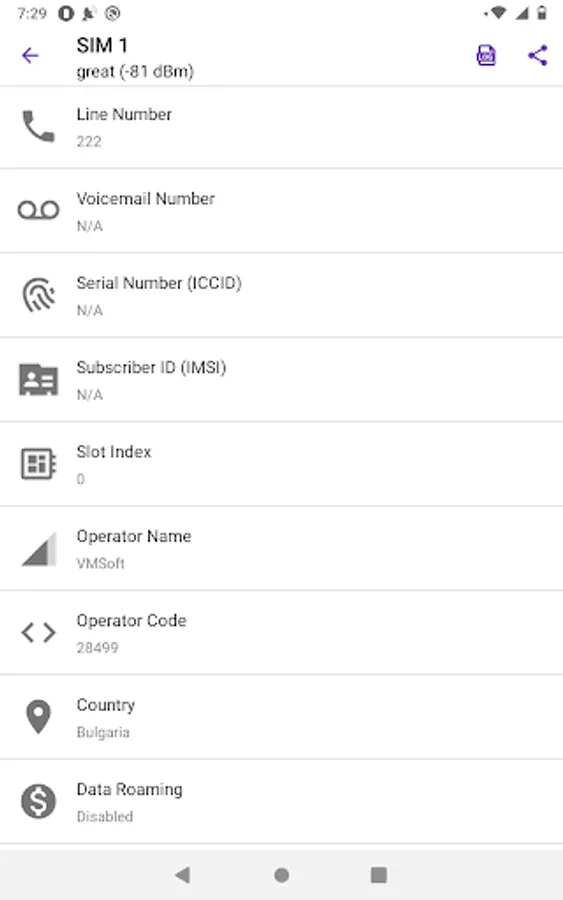 The app also provides information about device SIM cards such as phone number, voice mail number, SIM Card Serial number (ICCID), Subscriber Id (IMSI), mobile operator info and network type. This SIM card info can be easily shared by tapping on the share button or copied in the device clipboard.