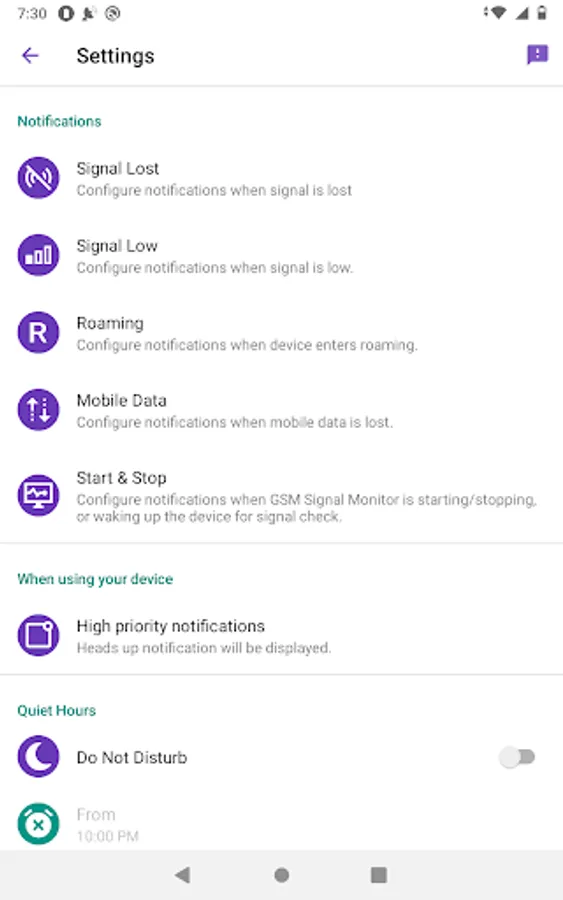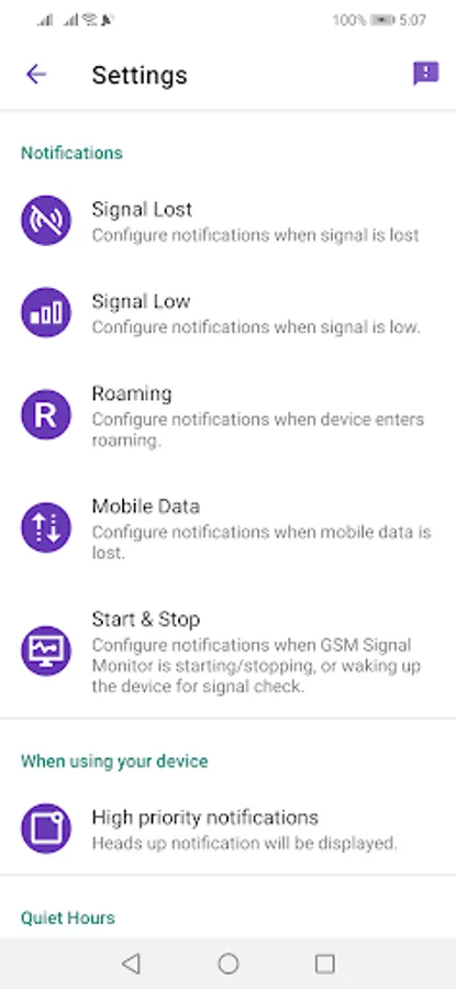 • Quiet hours (the app can be configured to suppress its notification during specified time period)