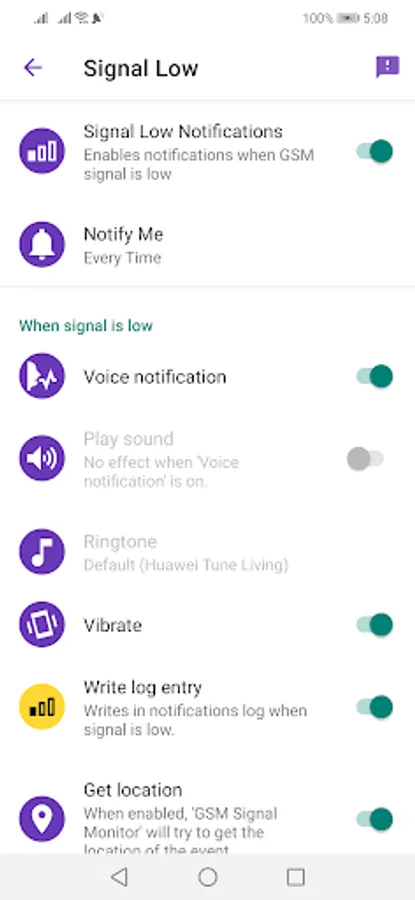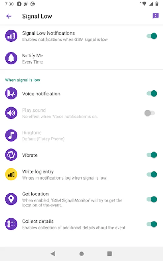 No signal / low signal alerts include: voice notifications, vibration, notification on the device screen and playing a ringtone. You can personalize how you get notified in the app settings.