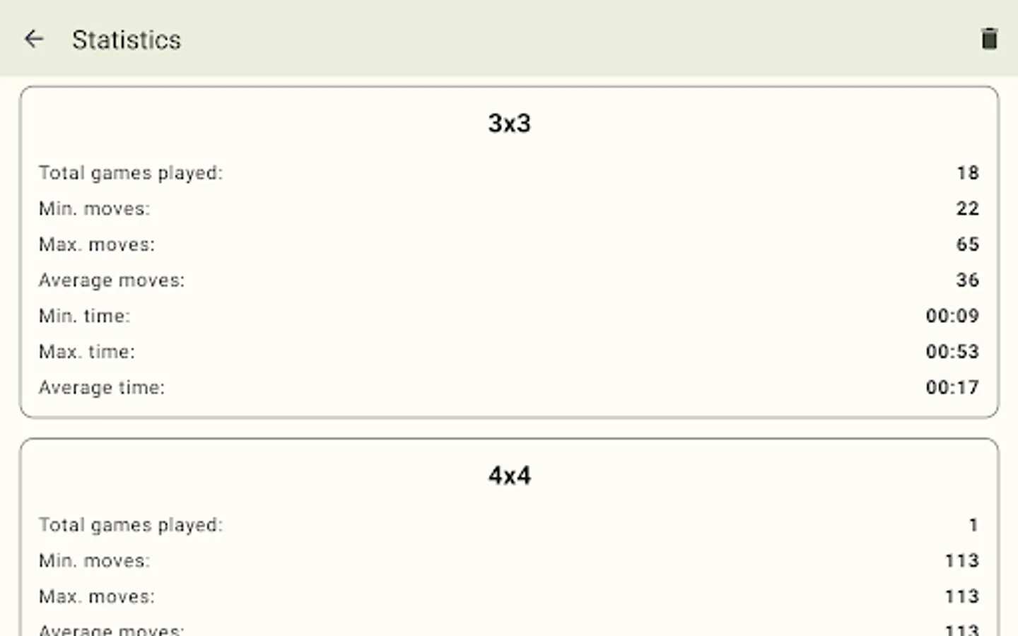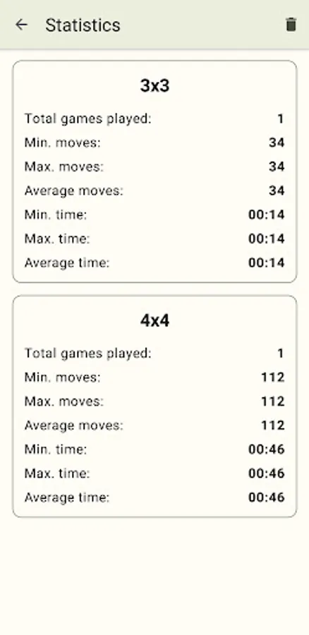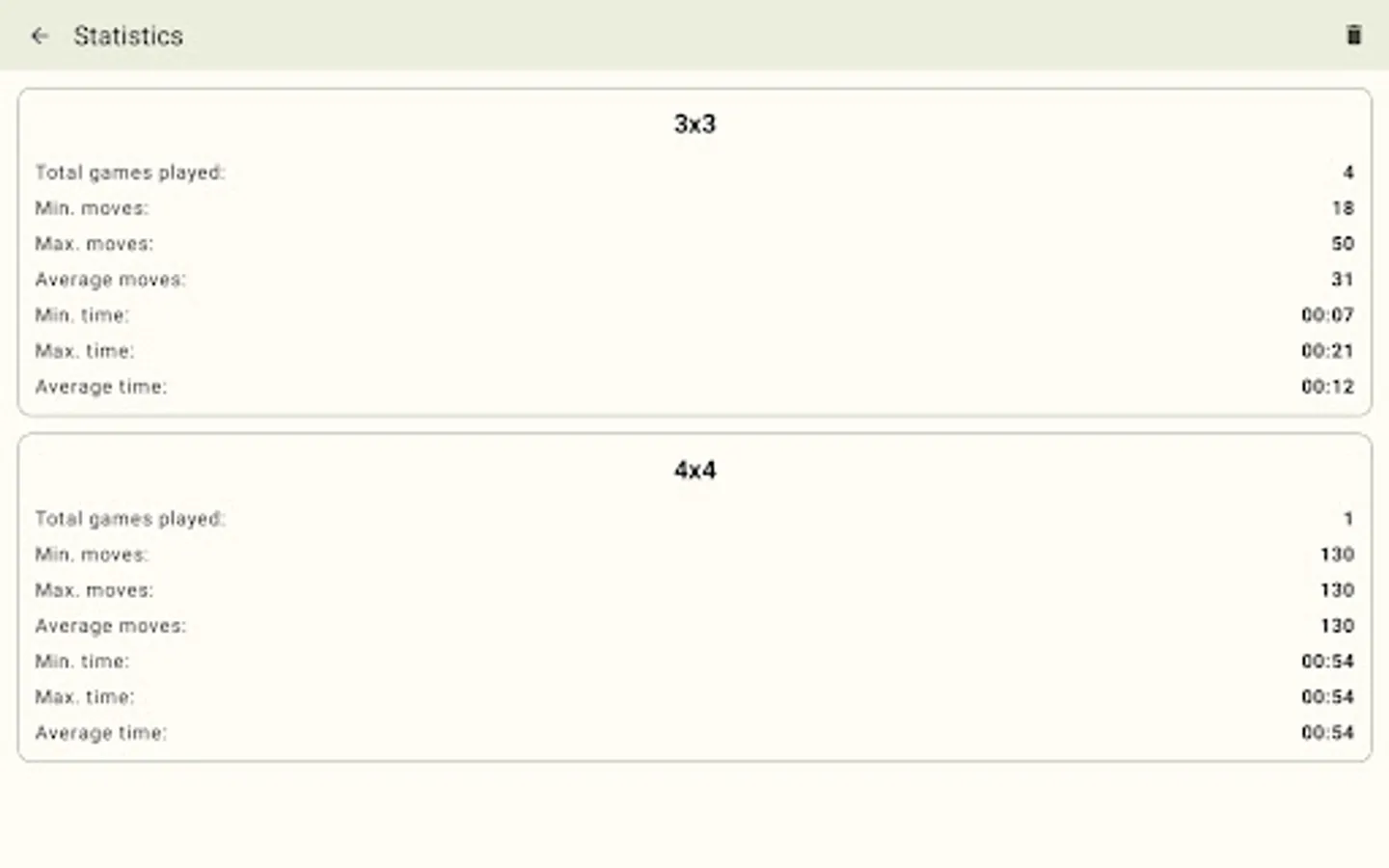 - Statistics for all game board sizes – total played games, minimal moves, maximum moves, average moves, minimum time, maximum time, average time.