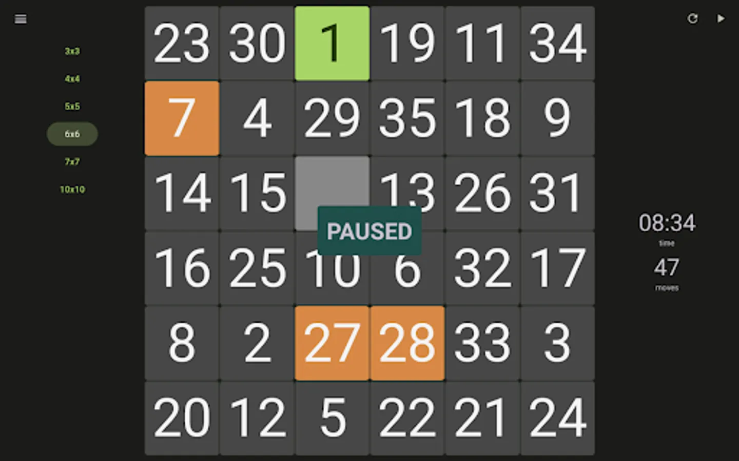 - Choose from six modes of difficulty levels (3x3, 4x4, 5x5, 6x6, 7x7, 10x10);