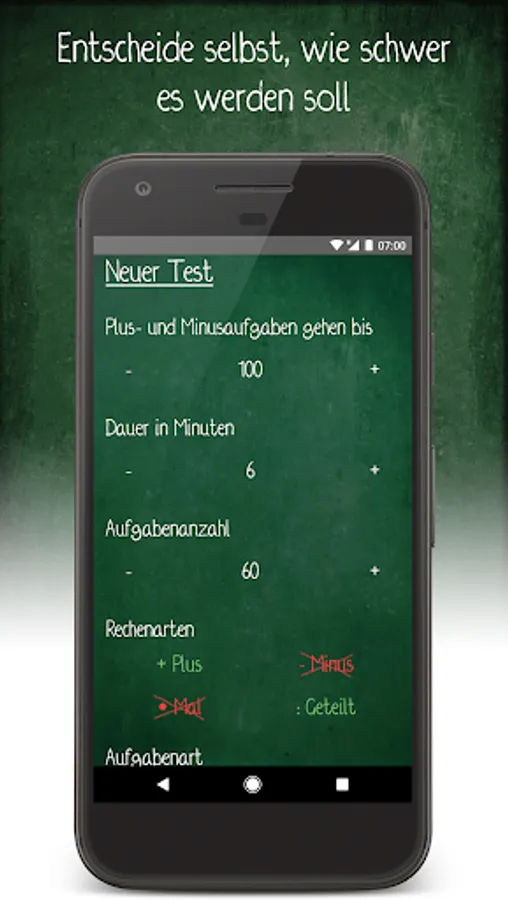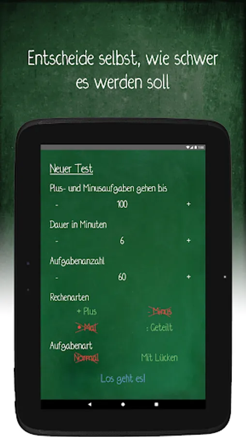 The standard test involves plus, minus, painting and Shared objects, which can be activated and deactivated at will. In addition, you can specify the duration of the test and the task number even the speed range. The adjustable speed range applies only to the plus and minus tasks; Painting and divided tasks always include the basics. Tasks that have caused problems in the past learning units are checked then common.