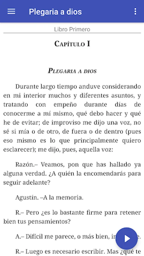This book takes the form of an "internal dialogue" in which questions are posed, discussions are held and answers are provided, leading to self-knowledge. The first book begins with an inner dialogue that seeks to know a soul. In the second book it is clear that the soul that Agustín wants to know is his own soul.