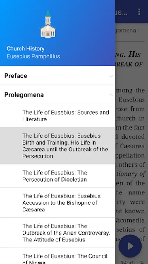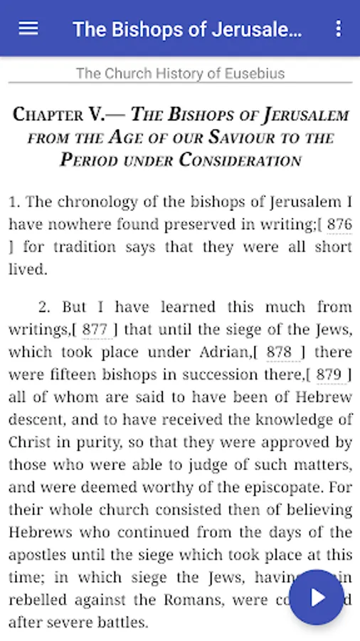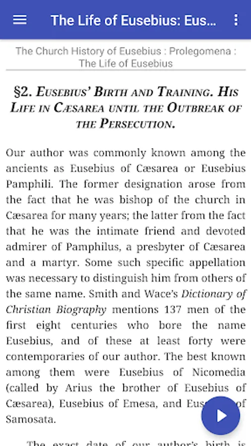 This app version of his history includes the "Life of Constantine" and "Oration in Praise of Constantine". The footnotes are linked to the text. Also all Bible references are linked the World English Bible for easy reference.