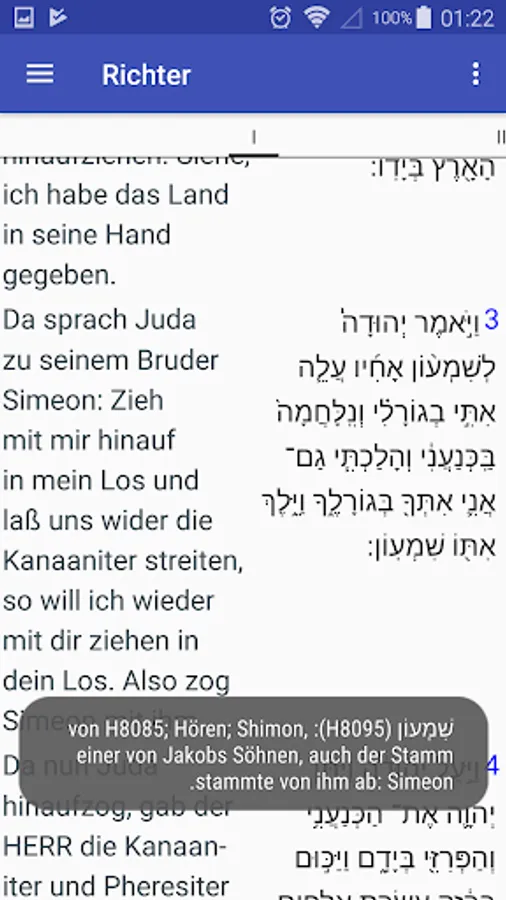 This is the parallel German Hebrew / Greek Bible. Martin Luther's translation of the Bible is presented next to the Hebrew and Greek. Every Greek or Hebrew word can be touched to see a dictionary definition.