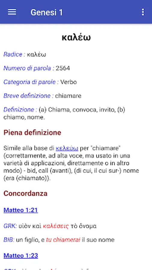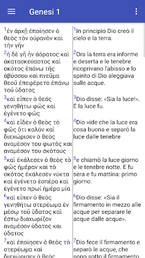 This app presents the Greek text of the Bible next to the Italian translation (Italian Episcopal Conference). Each Greek word is related to a dictionary definition and concordance that lists other positions of the Greek word in the Bible.