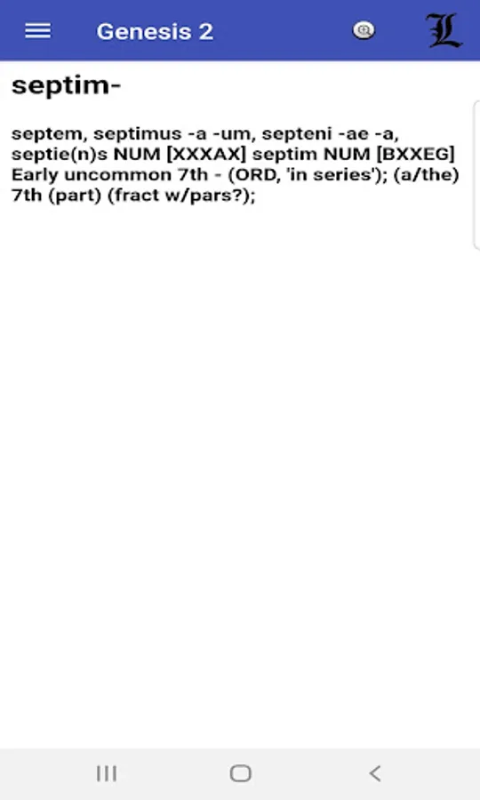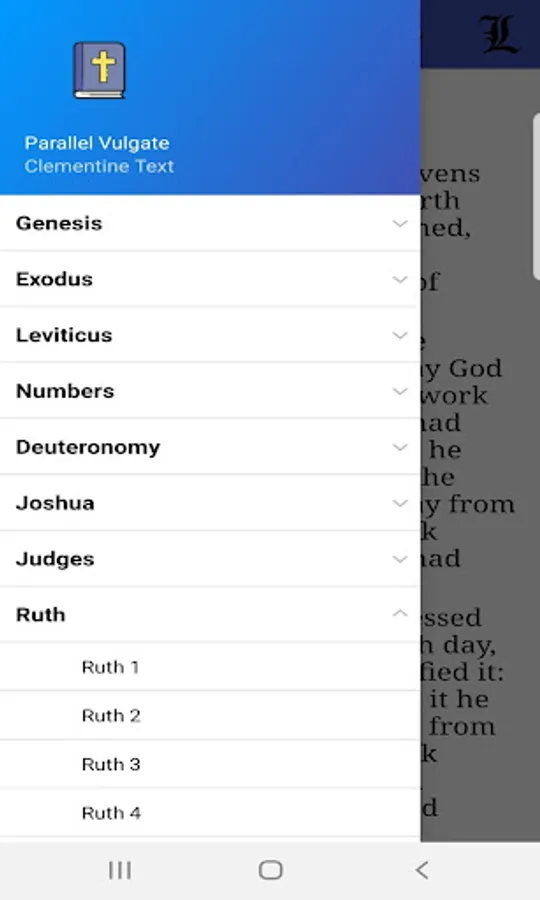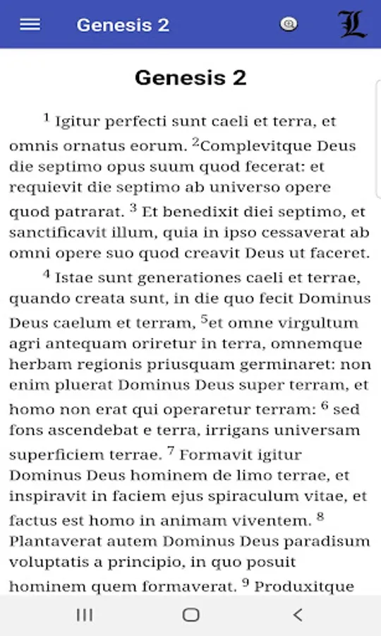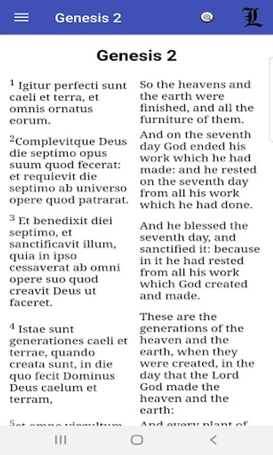 This app presents the Latin Clementine Vulgate alongside the Douay-Rheims Bible. Each word can be touched to bring up a dictionary definition.