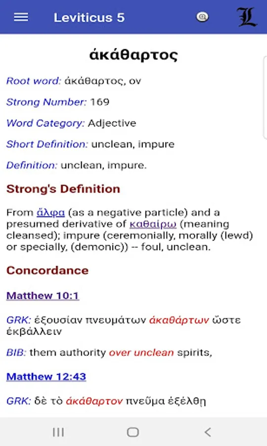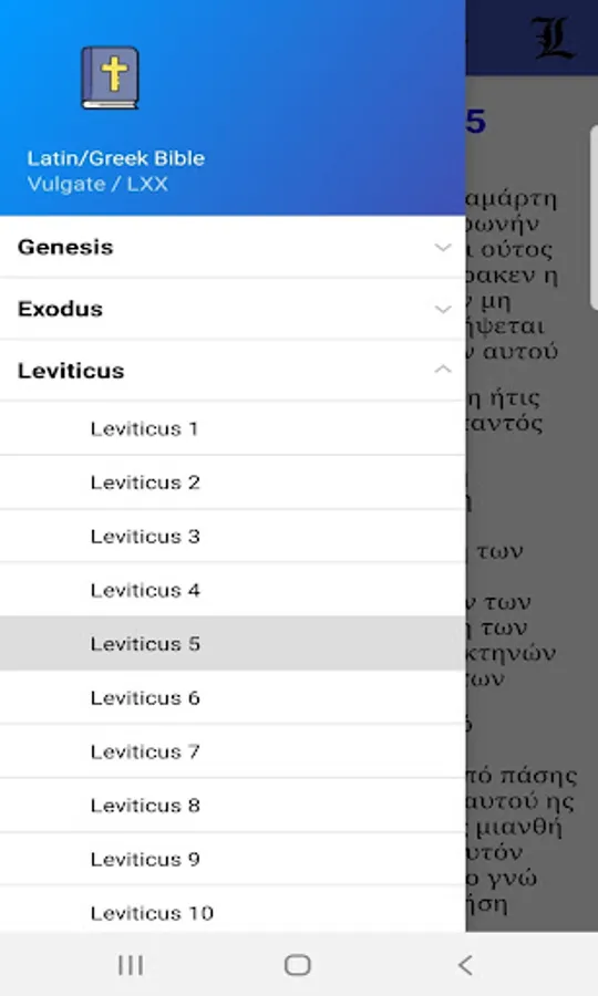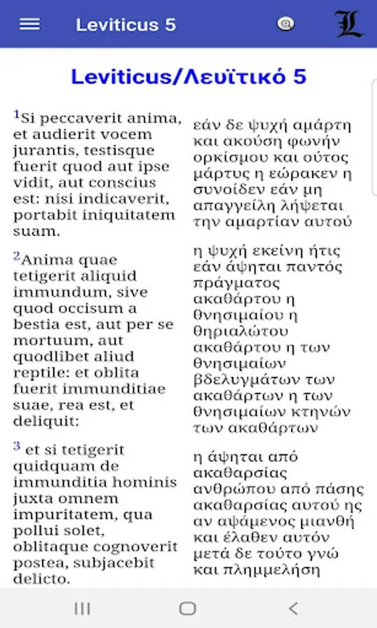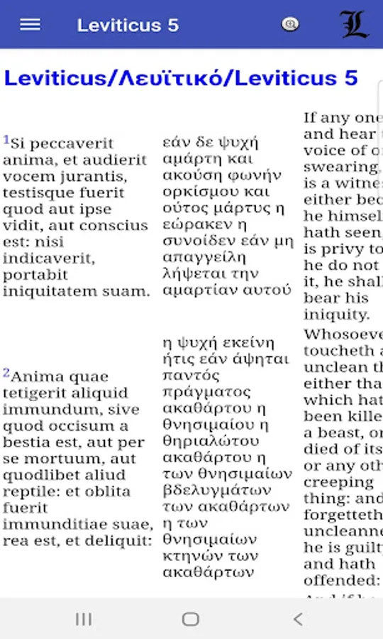 This app presents the Latin Clementine Vulgate alongside the Greek New and Old Testament with an optional English translation. Each Latin and Greek word can be touched to bring up a dictionary definition.