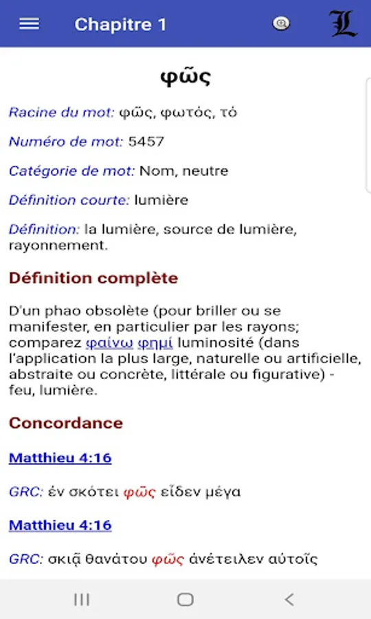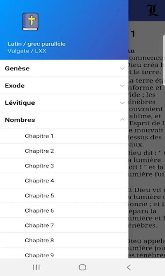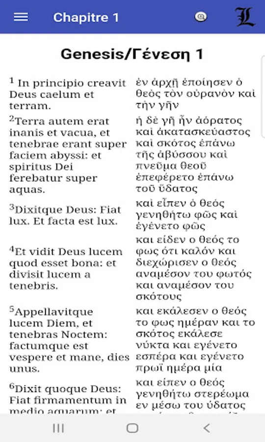 This app features the Latin Vulgate Clementine alongside the Greek New and Old Testament with optional French translation. Each Latin and Greek word can be tapped to bring up a dictionary definition.