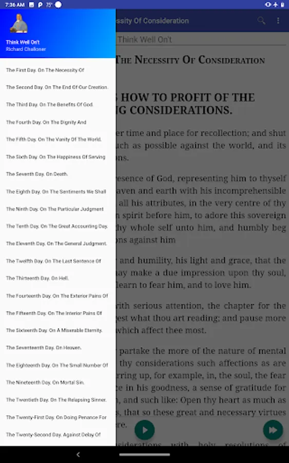 Richard Challoner (1691–1781) was an English Roman Catholic bishop. He is perhaps most famous for his revision of the Douay–Rheims translation of the Bible. In this work he gives reflections on the general truths about the Christian religion for each day of the month. He also provides an introduction about how to meditate on them throughout the day.