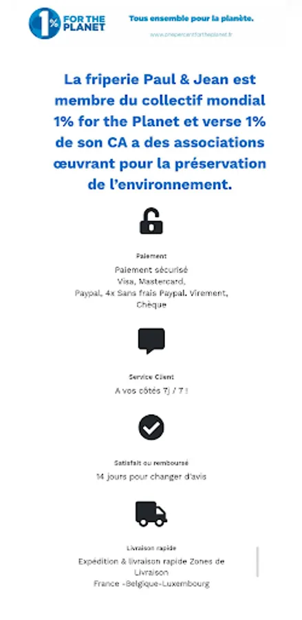 Our thrift shop Paul & John is committed to 100% in the recycling of all its products. We are in collaboration with the association 1% for the Planet France: a partnership which is in total agreement with our values. In E FF and, we choose products already worn or / and recycled with quality with 100% ethical materials. In E FF and, the improvement of our consumption habits is the first commitment of our shop and we will do everything to reduce our impact on the environment by offering pieces of qualities, recycled for a small price! Since yes, your situation matters us a lot! The packaging of your clothes will be designed with the least possible plastic (the plastic is recyclable and made by a French company).