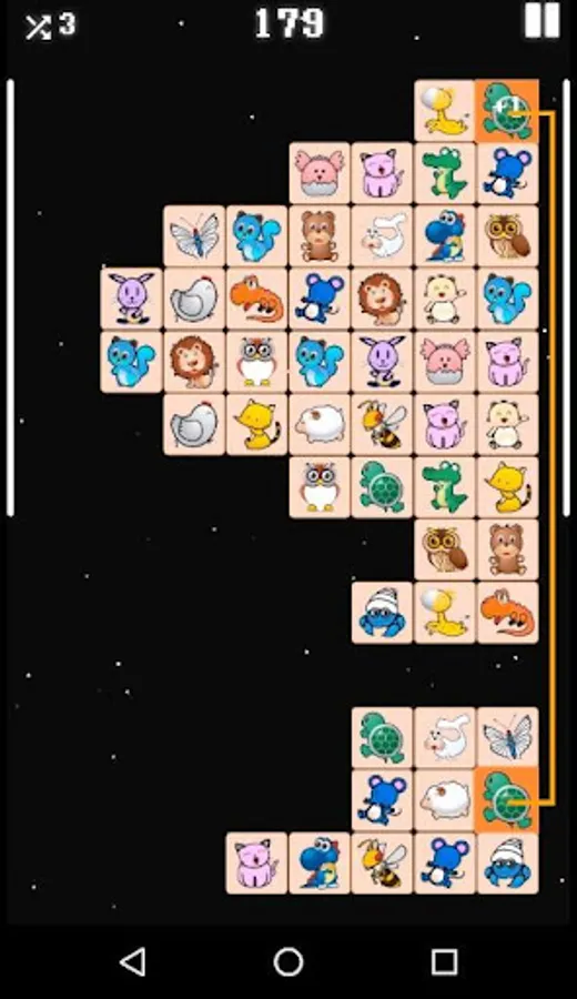 ✓ You have to find two identical icon tiles that can be connected with up to 3 straight lines where there is no other tiles blocking on the connecting line path.