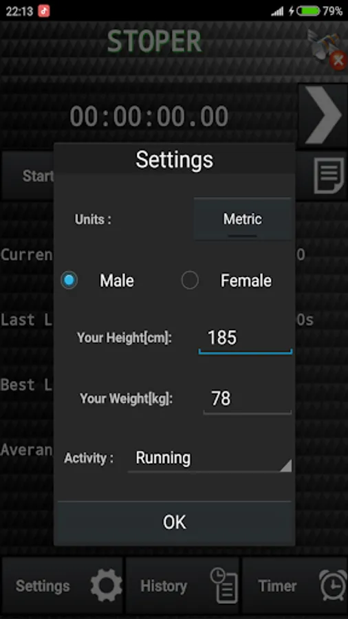 Before starting any exercise you need to specify your sex, height, weight and activity to determine the amount of calories that you burn during exercise.