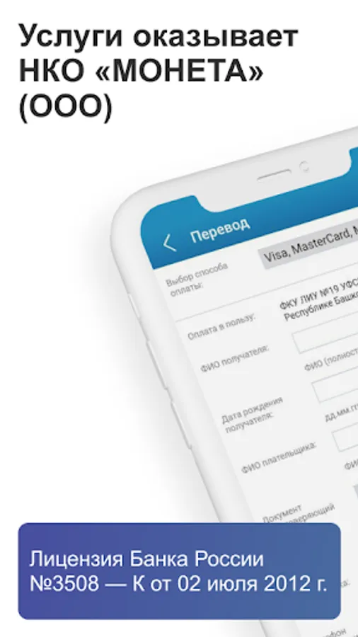 The services are provided by NPO MONETA (LLC) License of the Bank of Russia No. 3508 - K dated July 02, 2012.