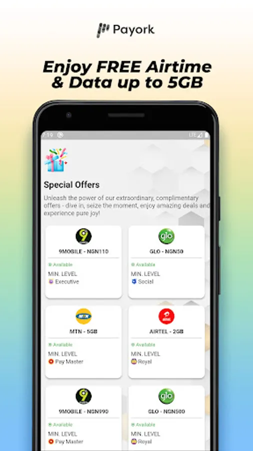 Introducing Payork, the ultimate Social Utility App designed to connect you with like-minded individuals who are eager to assist each other in clearing bills effortlessly. Whether it's Airtime, Data, Electricity, or Cable TV bills, Payork has got you covered, offering the cheapest rates for data packages along with an array of exclusive benefits.