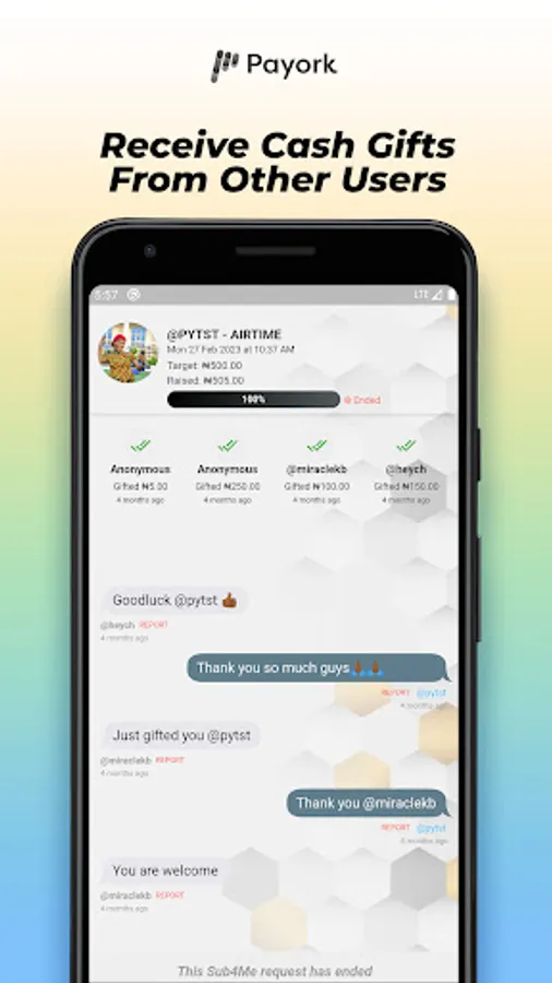With Payork, managing your finances is a breeze. Fund your wallet seamlessly by transferring from any bank using your unique virtual account number, conveniently accessible on your profile page. Furthermore, enjoy the instant gratification of sending and receiving cash gifts with just a few taps.