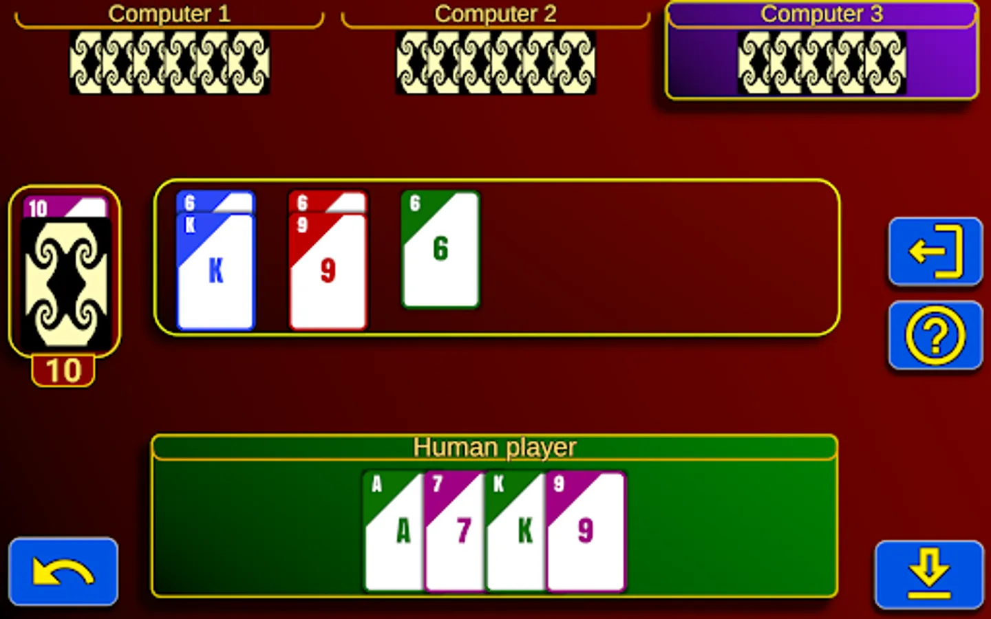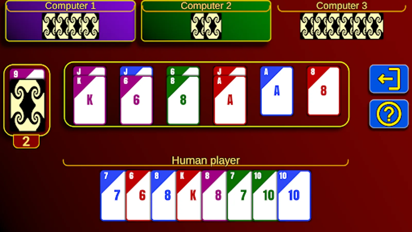The game consists of a total of 36 cards divided into four suits. The purple suit represents the joker or trump suit. Trump cards have the ability to cover all cards of other suits, while trump cards of different trump suits can be beaten based on their value.