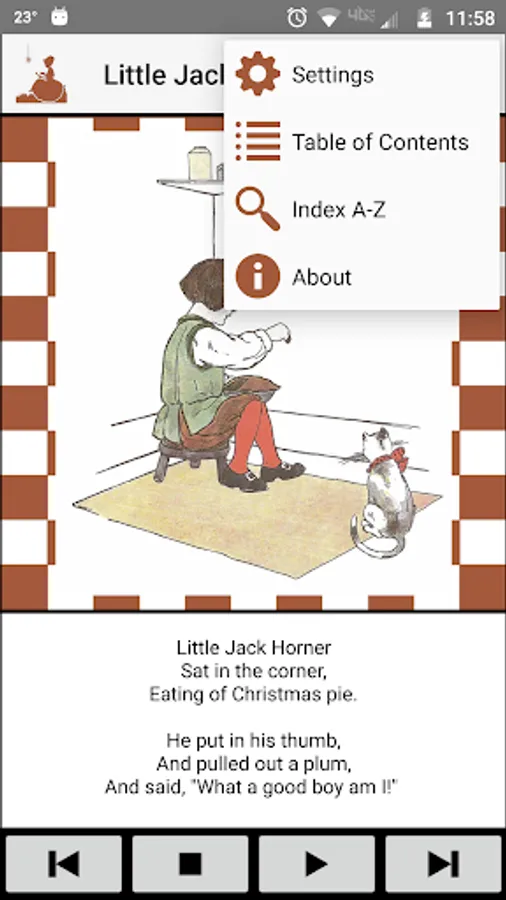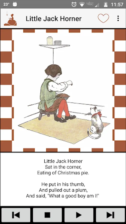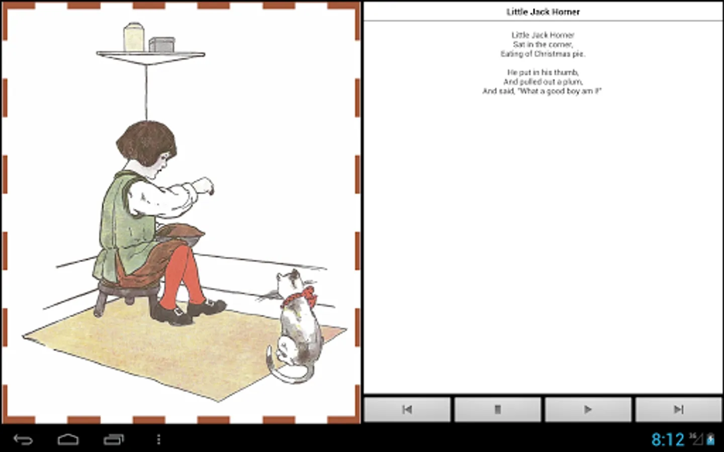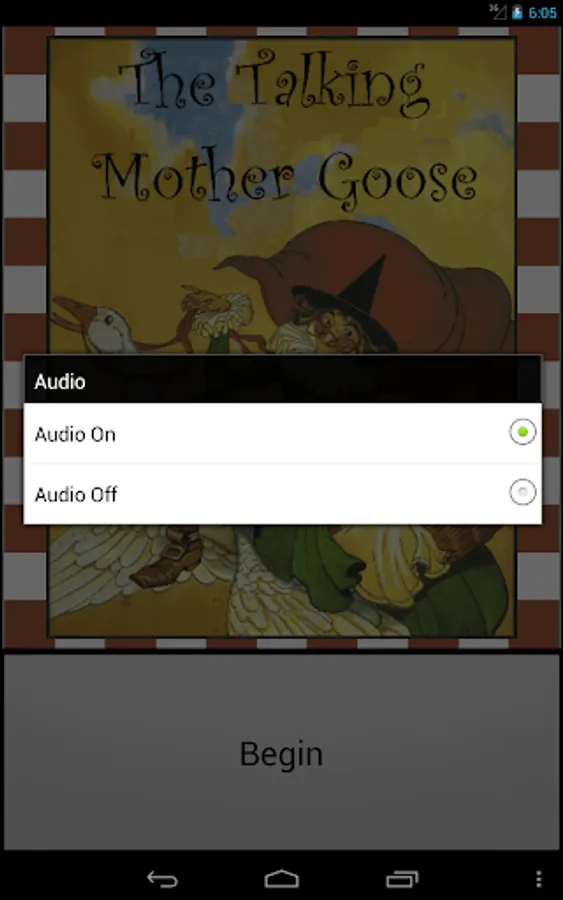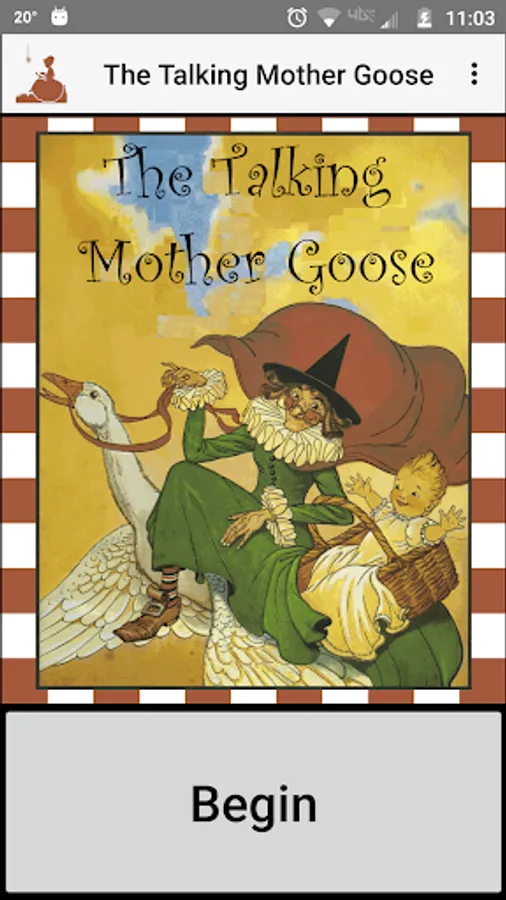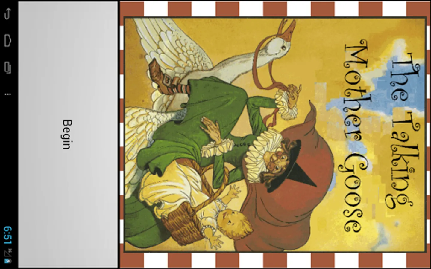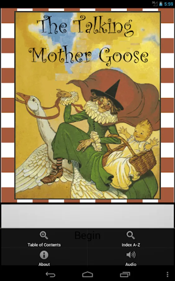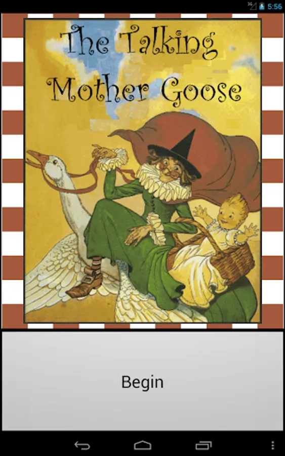 The Talking Mother Goose is an on-demand nursery rhyme player application for Android powered smartphones and tablets. The Talking Mother Goose features the nursery rhymes of Mother Goose, the illustrations of Blanche Fisher Wright, and audio recordings from PC Phone Connections.