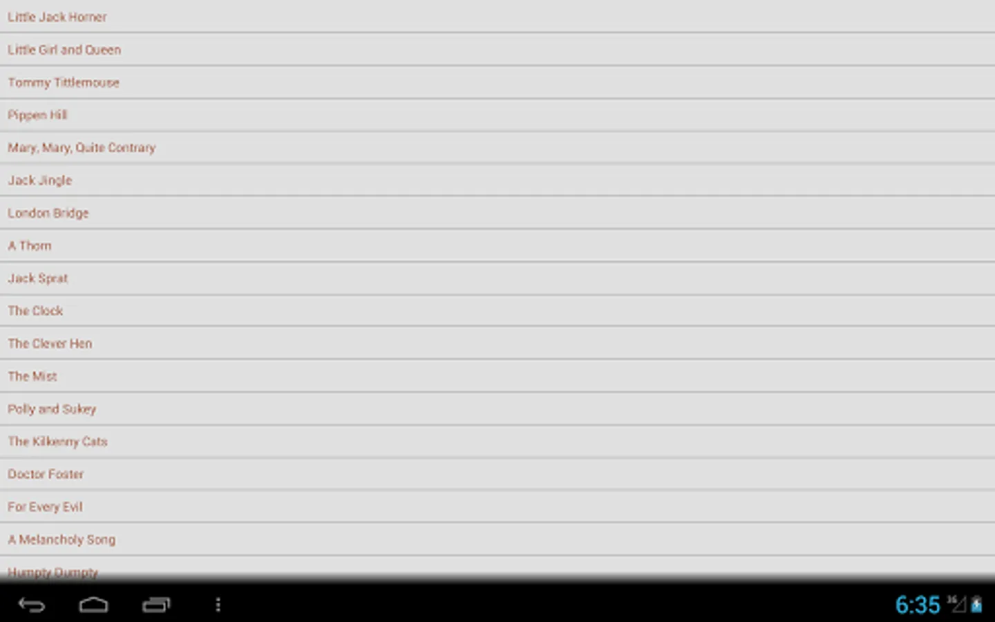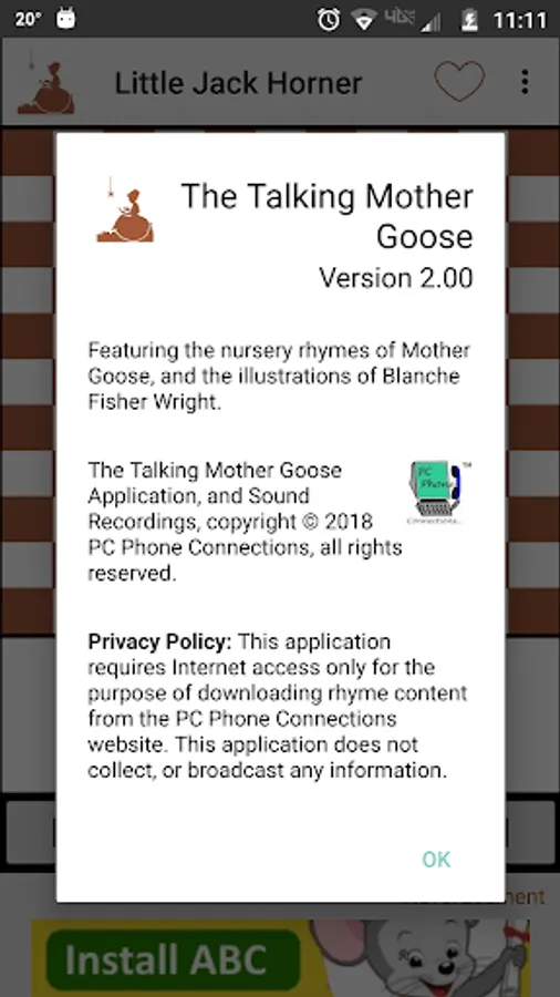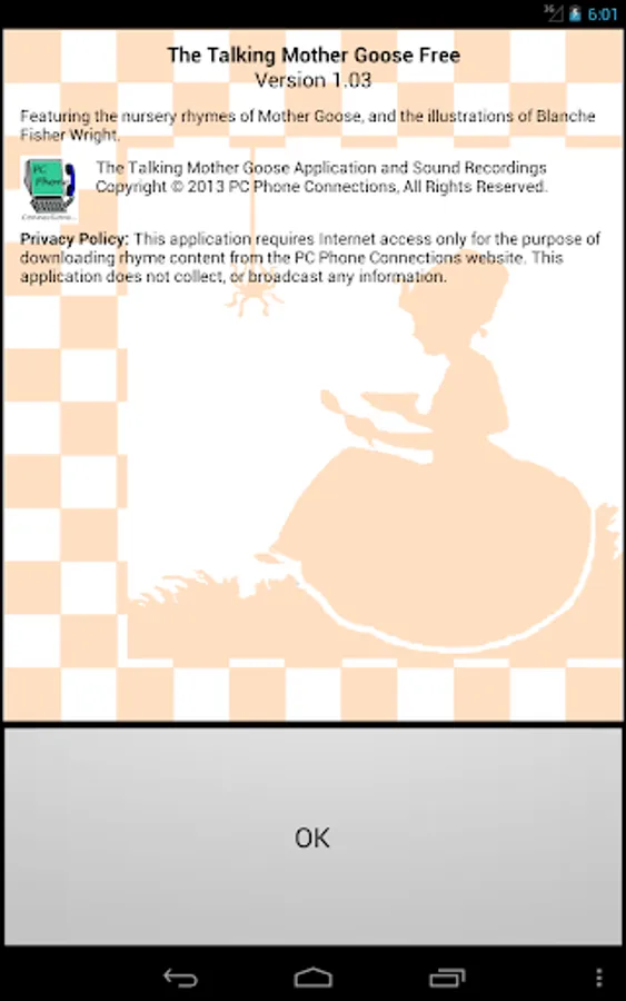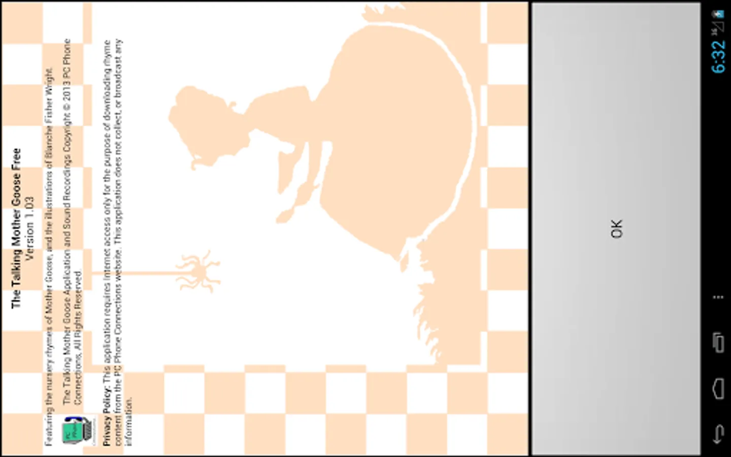 Privacy Policy: This application requires Internet access only for the purpose of downloading rhyme content from the PC Phone Connections website. This application does not collect or broadcast any information.
