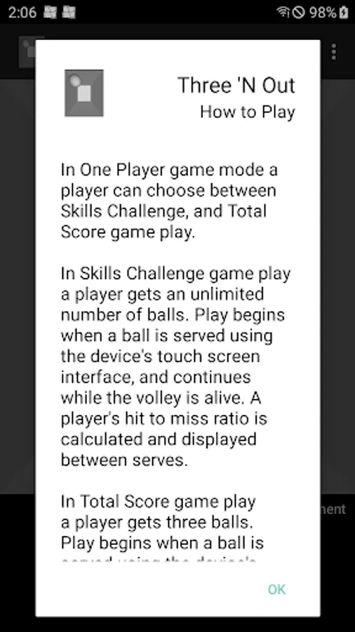 In Skills Challenge game play a player gets an unlimited number of balls. Play begins when a ball is served using the device's touch screen interface, and will continues while a volley is alive. During that time, the player's hit to miss ratio is calculated and displayed between serves.