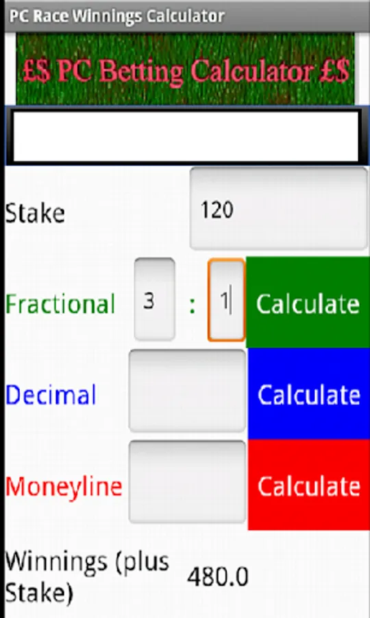 This app calculates winnings based on the stake entered and fractional, decimal or moneyline odds.