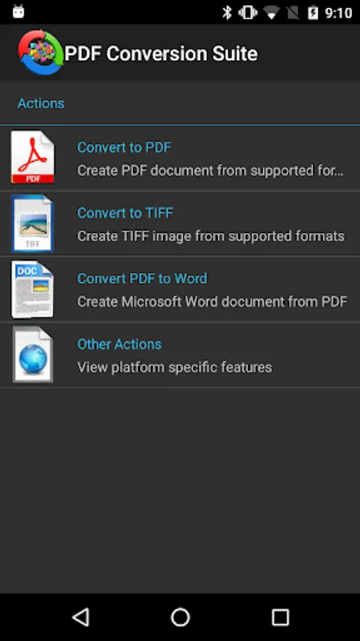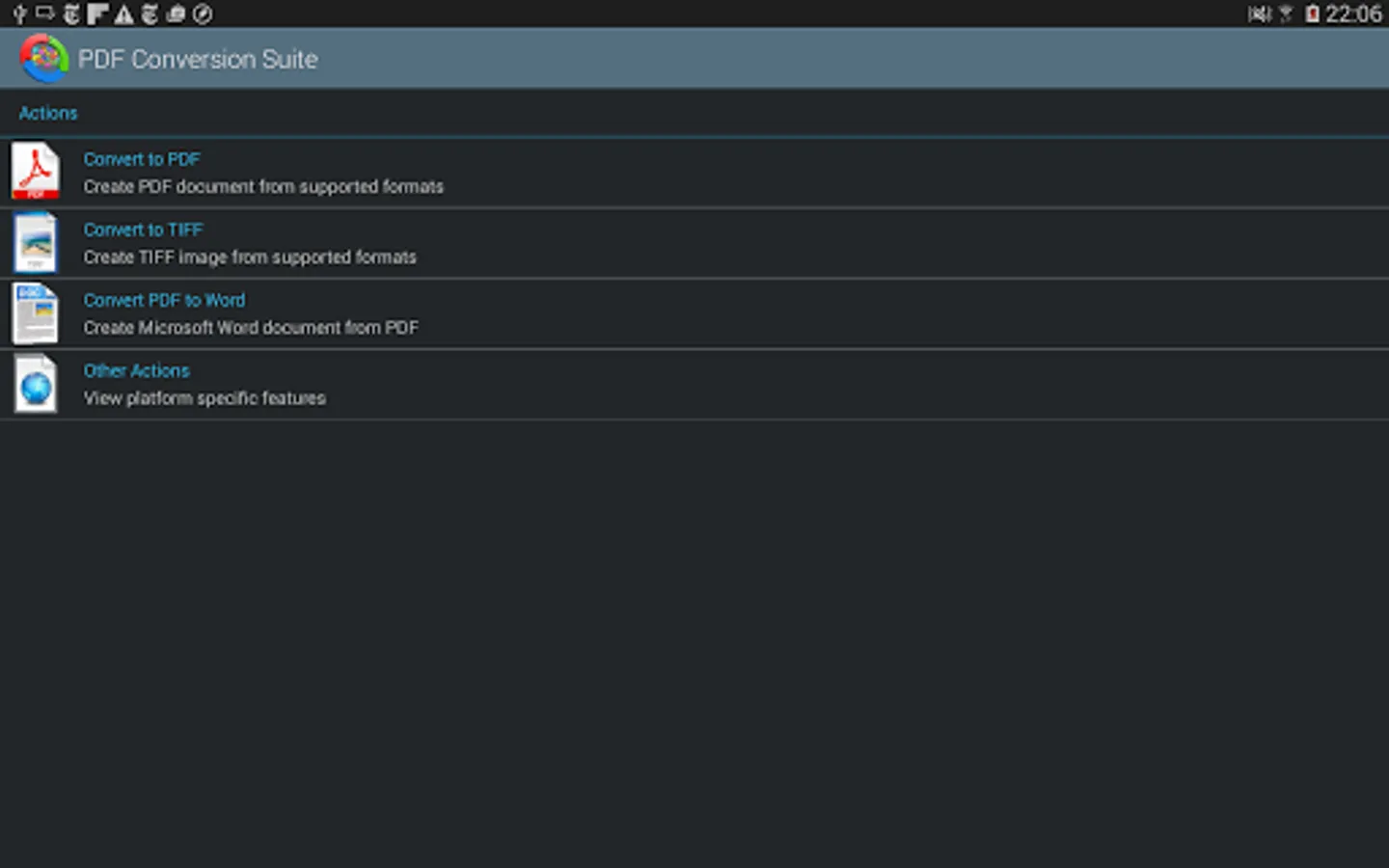 PDF Conversion Suite creates PDF or multipage TIFF from various document formats. Also it could convert your PDF file to Microsoft Word Document(docx). You just need to select action and source document to start conversion process.