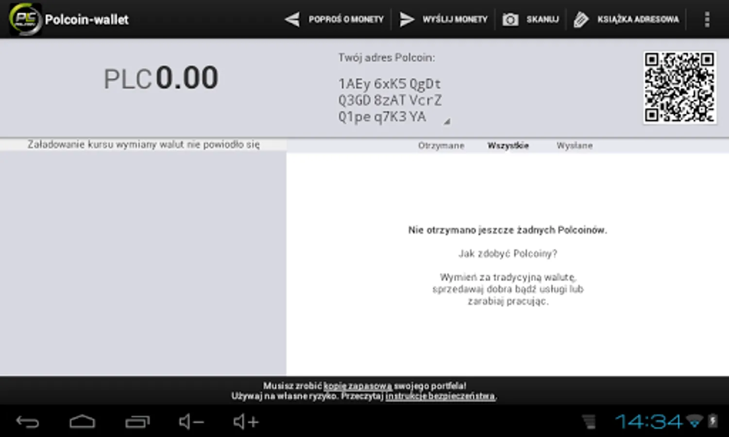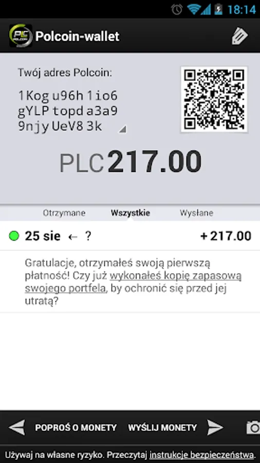You use at your own risk! The team of developers is not responsible for any loss of Polcoin balance on a mobile device, e.g. as a result of theft or damage to physical equipment. Always remember to keep a copy of your private keys in a safe place.