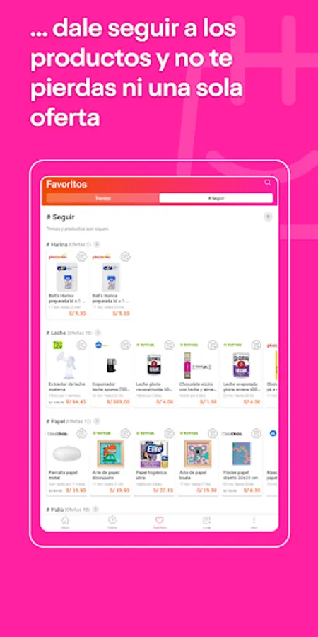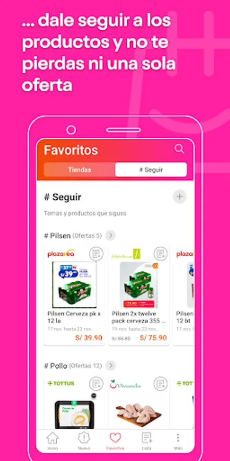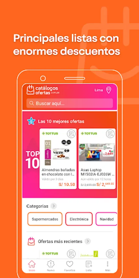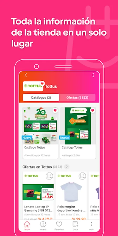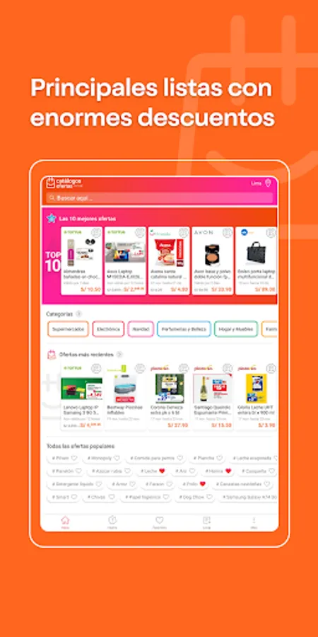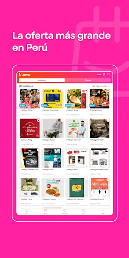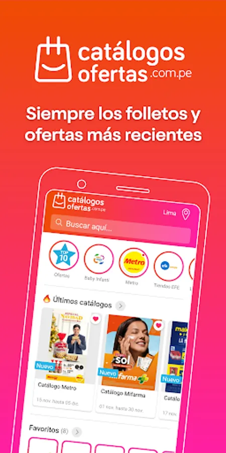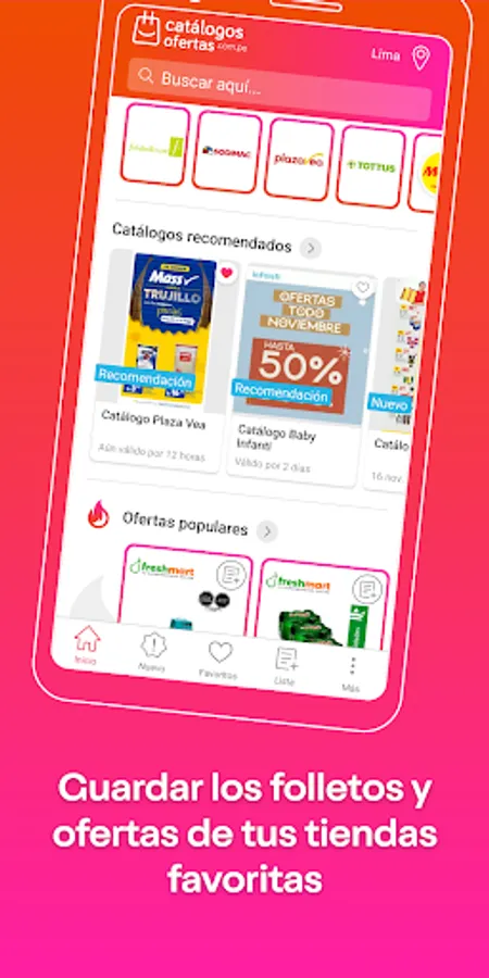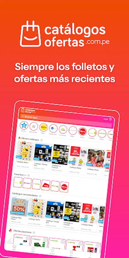 Our application Catalogosofertas.com.pe shows you all the current catalogs of small and large chain stores in Peru, and not only supermarkets and construction stores, but also electronic, fashion, toy, computer, pharmacy and much more more. We have even included most of the local stores. Do you want to select a store as a favorite? You can do it easily by clicking on the heart. In this way, you will always be the first to find out about current promotions in your favorite stores, and you will be able to create a practical compilation of all your favorite catalogs.