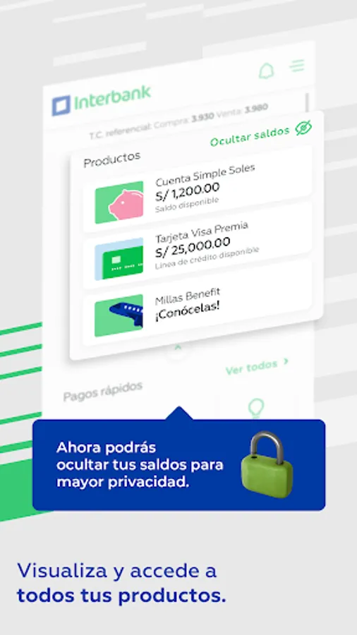 - Check the balances and movements of your accounts and cards. Also, now you can hide your balances for more privacy.