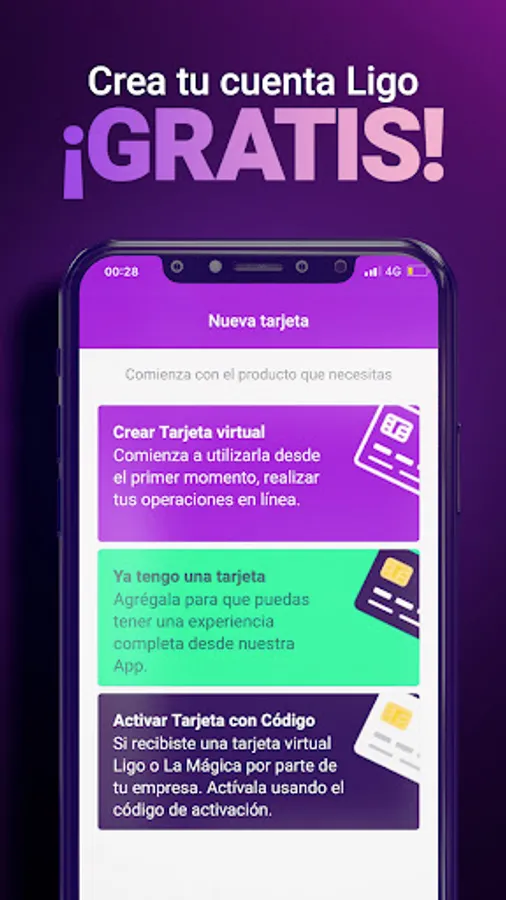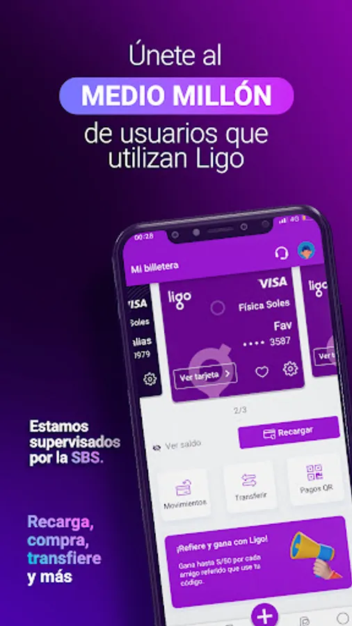 The Visa and Mastercard under the Ligo brand, is issued by Tarjetas Peruanas Prepago SA and supervised by the SBS (Superintendency of Banking, Insurance and AFP) under the Electronic Money Issuing Company Law. Ligo is an application for smartphones through which you can manage Visa and/or Mastercard cards.