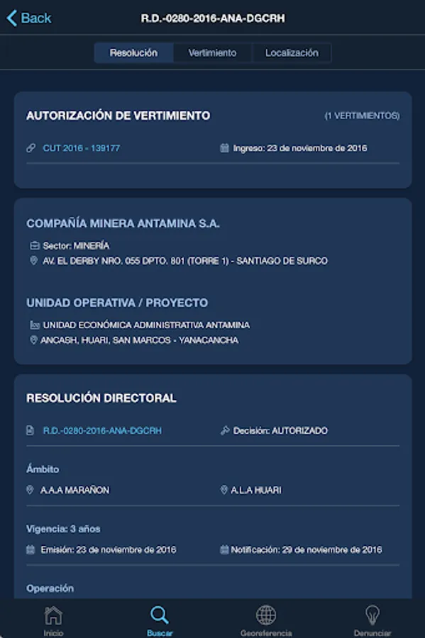 Mobile Application Consultation Directorial Resolutions of Vertimientos of the National Water Authority.