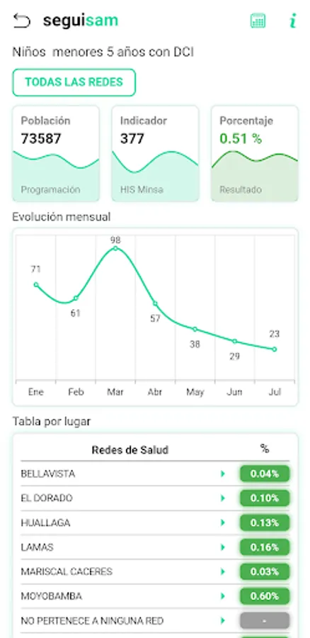 The purpose of the application developed is to improve the monitoring of the various indicators of the health sector (Sanitary, F.E.D., Agreement, etc.) of the different networks in the San Martín region, having as its main characteristic the accessibility of information.