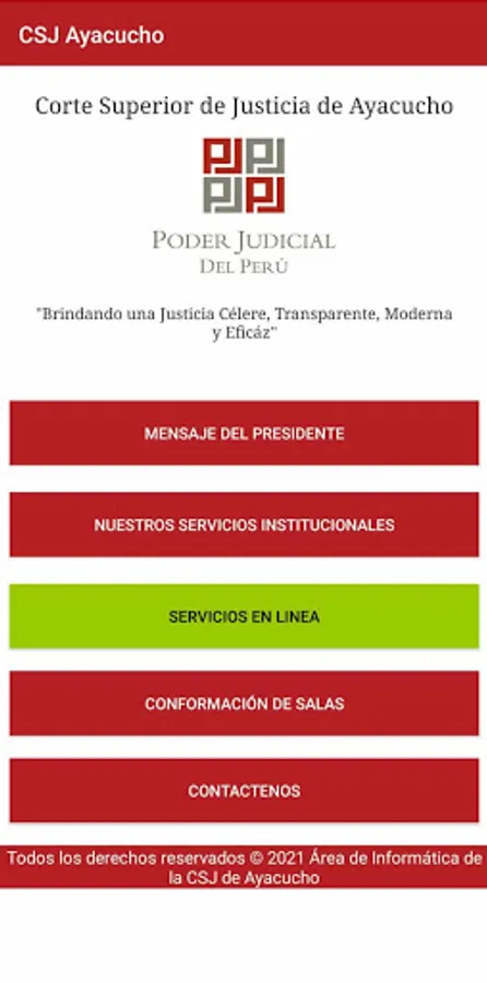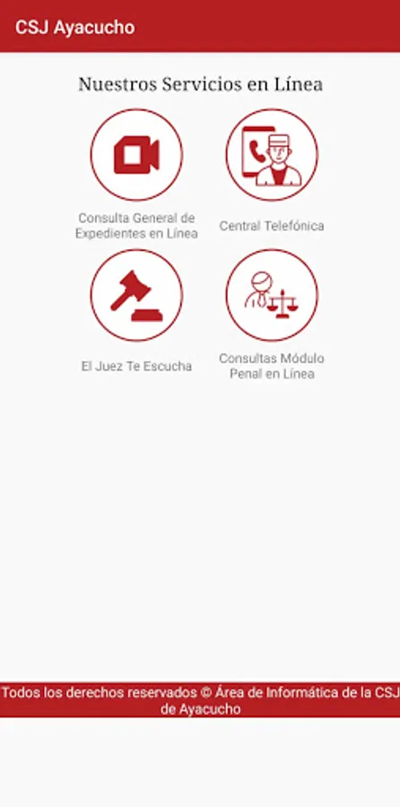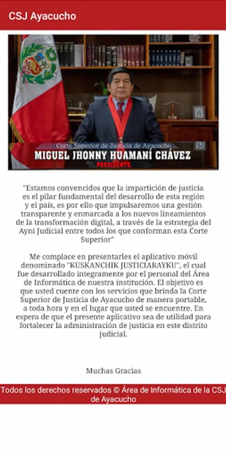 The application of the CSJ of Ayacucho - "Kuskanchik Justiciarayku" was developed to facilitate the access to the users in the services that the CSJ of Ayacucho offers in a portable way, at any time and in the place that is. Waiting for the present application to be useful to strengthen the administration of justice of the judicial district of Ayacucho - app cjsayacucho.