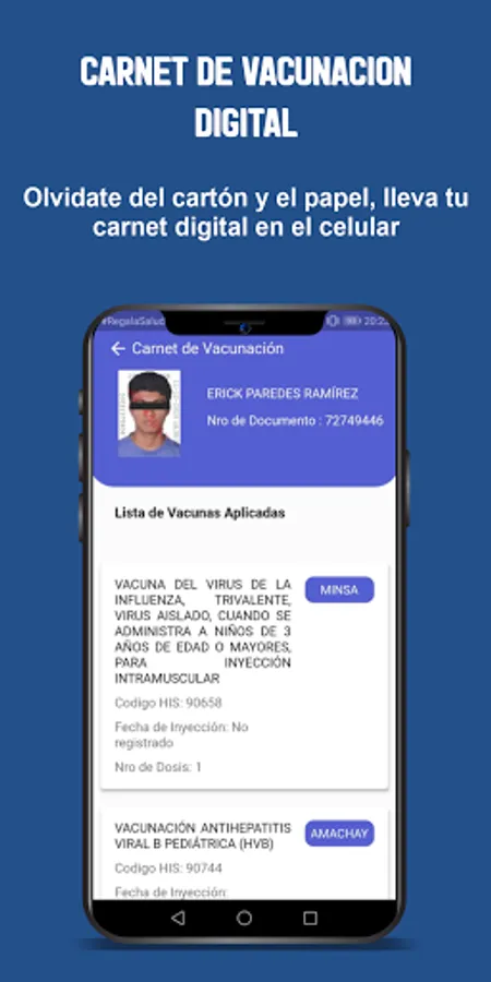This application will allow health professionals to enter a new digital era, in which they will be able to know in real time, the information of vaccinated people, facilitating the work of health professionals who will be able to register patients, consult the type of vaccine, the doses and the dates in which they were immunized, also allowing to identify people who have not yet received immunization.