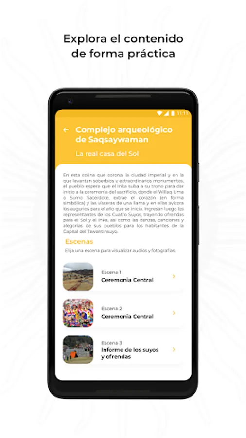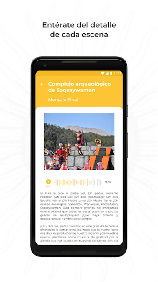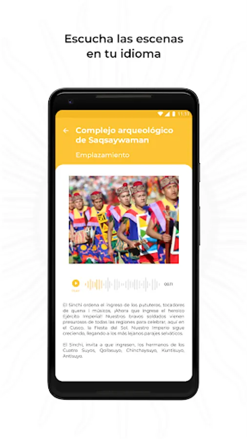 Translation system that allows Inti Raymi attendees to listen in a minimum of 04 languages (English, French, German and Spanish by default); a summary of what happens (or a meaning) in each of the scenes or stages that are represented in the event.The application will be exclusively accessible to certain users who have registered for the INTI RAYMI event.