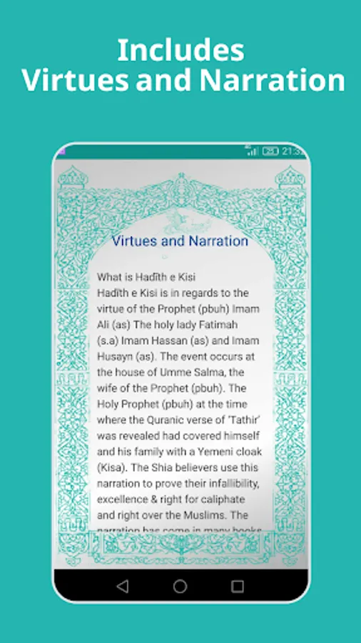 Hadith e Kisa is in regard to the virtue of the Prophet (pbuh) Imam Ali (as) The holy lady Fatimah (s.a) Imam Hassan (as) and Imam Husayn (as). The event occurs at the house of Umme Salma, the wife of the Prophet (pbuh). The Holy Prophet (pbuh) at the time where the Quranic verse of ‘Tathir’ was revealed had covered himself and his family with a Yemeni cloak (Kisa). The Shia believers use this narration to prove their infallibility, excellence & right for caliphate and right over the Muslims. The narration has come in many books such as “Mafatih Al-Jinan’ which was written by Sheikh Abbas Qummi (r.a) and the narration can be found by it's famous title Hadīth e Kisa. It has also been narrated in many older sources of Sunni and Shia literature.