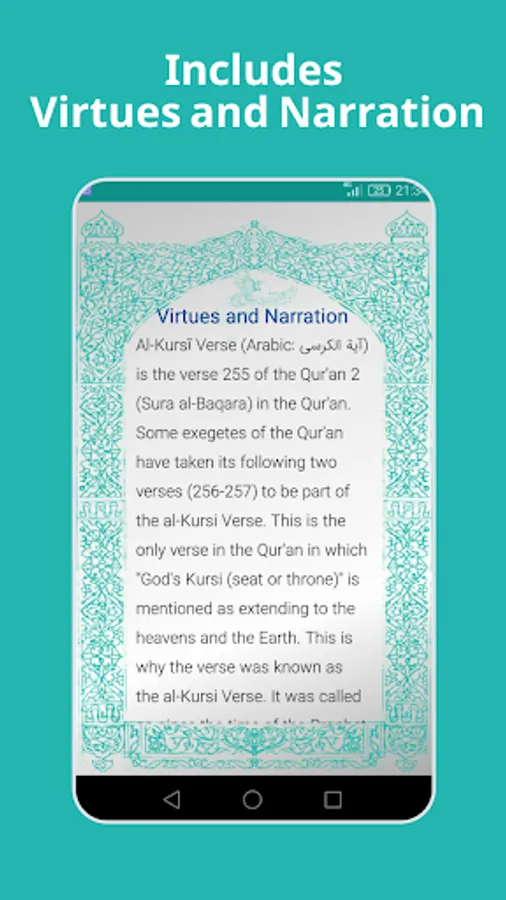 Al-Kursī Verse (Arabic: آیة الکرسی) is the verse 255 of the Qur'an 2 (Sura al-Baqara) in the Qur'an. Some exegetes of the Qur'an have taken its following two verses (256-257) to be part of the al-Kursi Verse. This is the only verse in the Qur'an in which "God's Kursi (seat or throne)" is mentioned as extending to the heavens and the Earth. This is why the verse was known as the al-Kursi Verse. It was called so since the time of the Prophet (s).