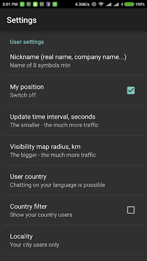 7) Info update frequency is adjustable. If you are on map or the users list - the update frequency is maximal, as set in the settings. If you go to other apps - it's 6 times more slow for the data traffic economy.