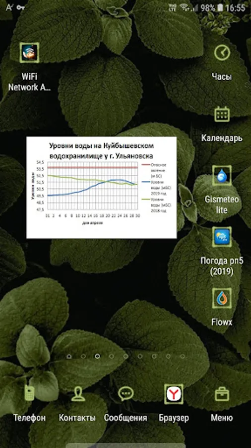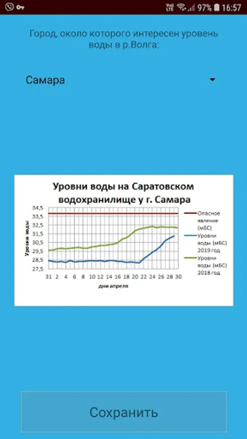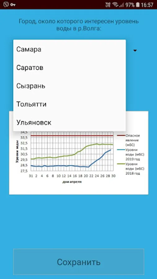 An application showing a widget with a graph of the water level of the Volga River in the corresponding reservoirs of five cities: Samara, Saratov, Syzran, Togliatti, Ulyanovsk.