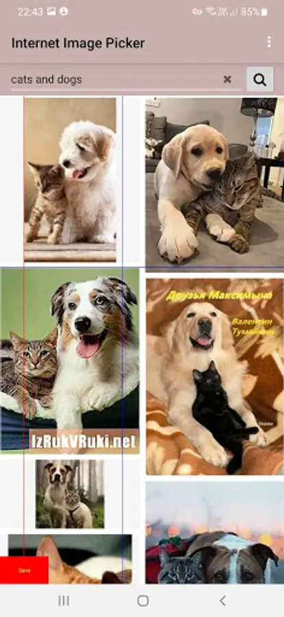 Just enter a text to find pictures, scroll and choose one needed and save it - all by the single red button in the left-bottom corner.