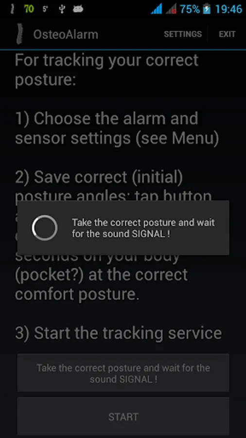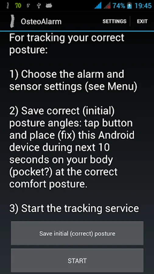 2) Save correct (initial) posture angles: tap button and place (fix) this Android device during next 10 seconds on your body (pocket, phone case) at the correct comfort posture.