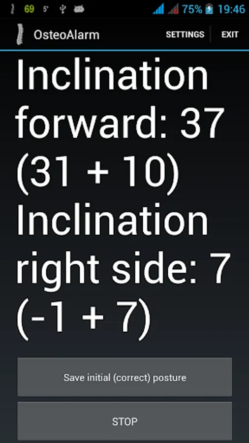 This app is tracking your posture tilt by 4 sides and warns by sound orand vibration if your body inclination angles are outside the selected limits.